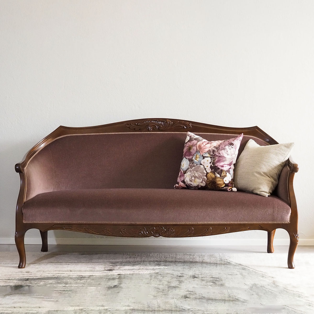 Talonpoikaisrokokoo-sohva, väri amerikanpähkinä, verhoilu mohair luumu.