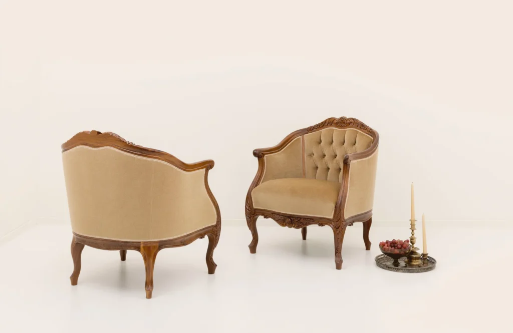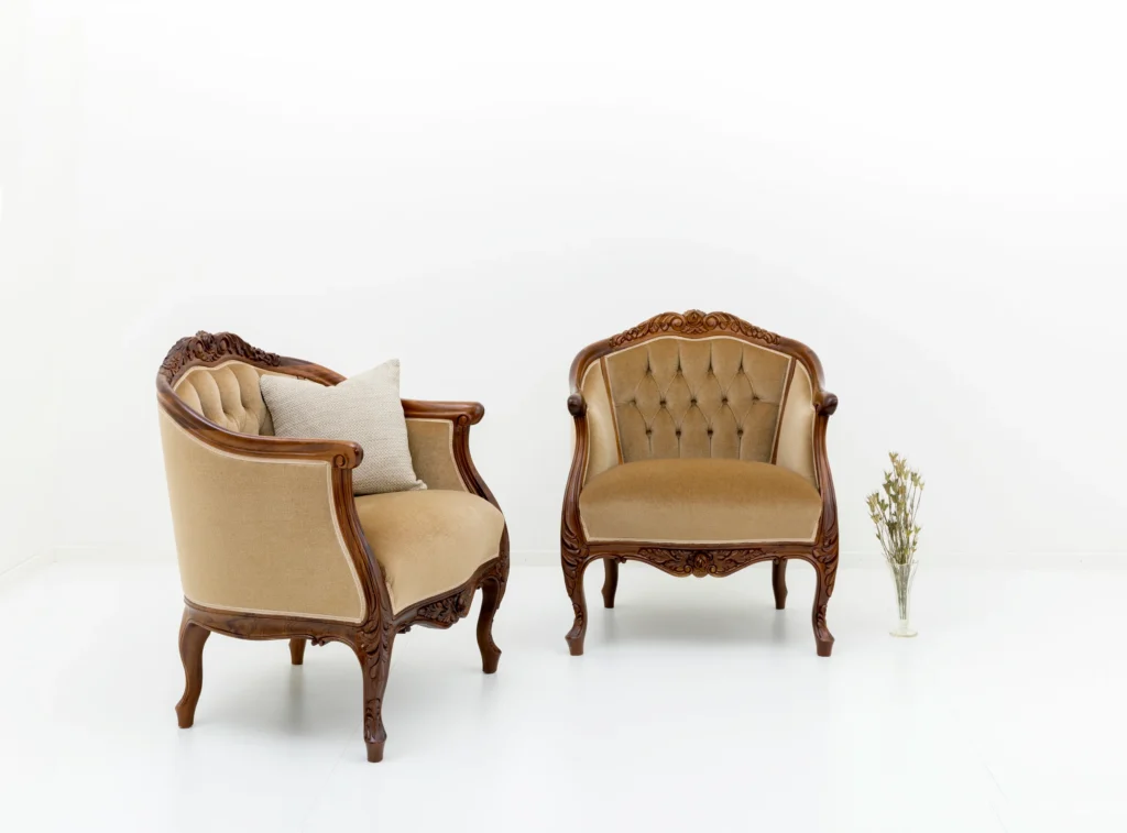 Yksi rokokoontyylin kulmakivistä on leikkisyys! Koska valmistamme jokaisen tuotteen Suomessa omalla tehtaallamme, sinulla on mahdollisuus leikitellä rohkeasti väreillä ja materiaaleilla. Vakiokankaiden sijaan voit tilata kalusteet vapaavalintaisella kankaalla verhoiltuna. Tällöin voit hankkia verhoilukankaan itse ja lähettää sen tehtaallemme tuolien valmistusta varten. Suosittelemme ranskanrokokooistuinten verhoilukankaaksi yksiväristä kangasta, joka antaa oikeutta selkänojan koristeelliselle napitukselle.