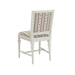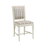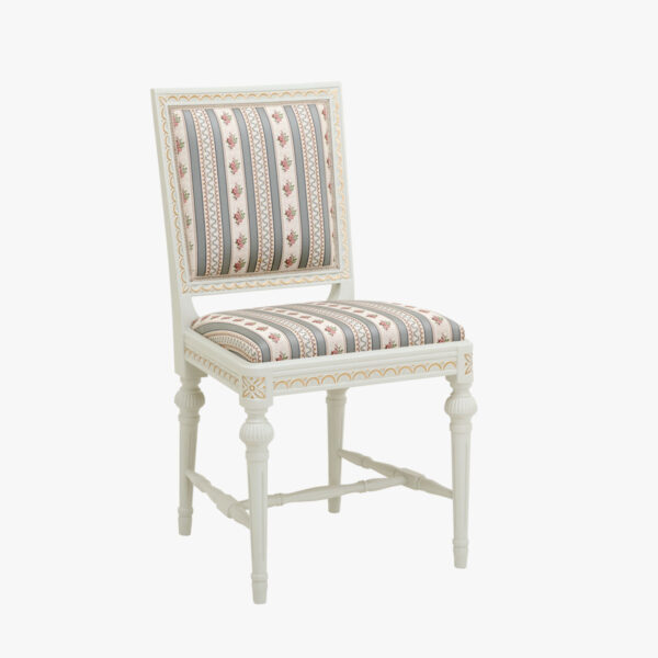 Kustavilaistyyliset tuolit verhoillulla selkänojalla.