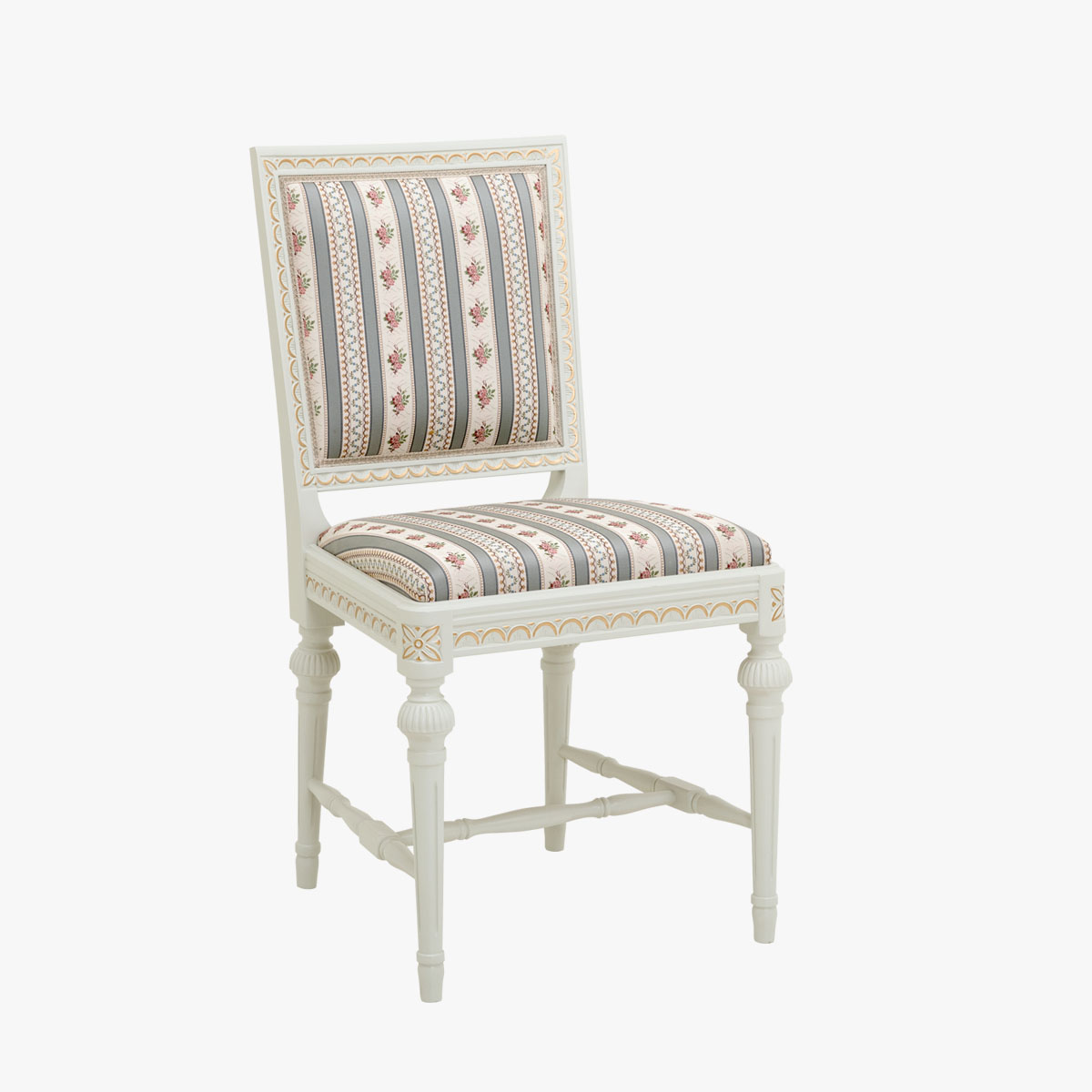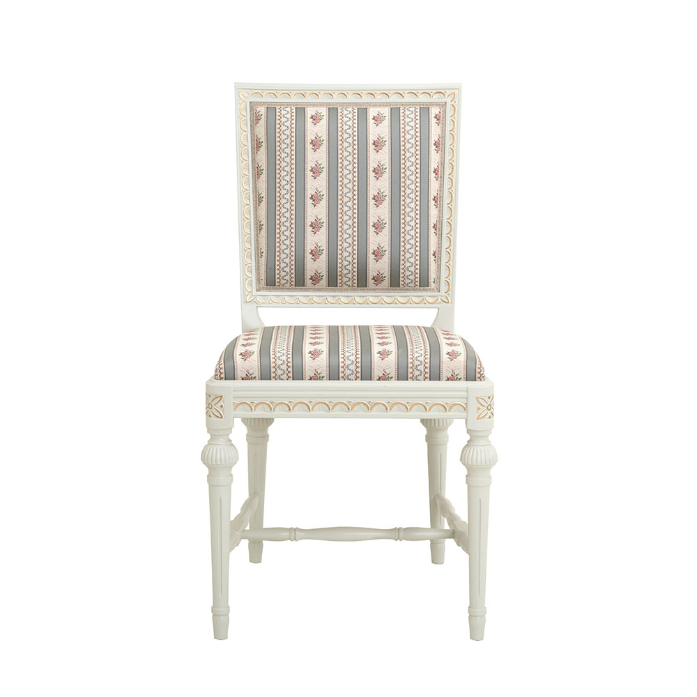 Kustavilaistyyliset tuolit verhoillulla selkänojalla.
