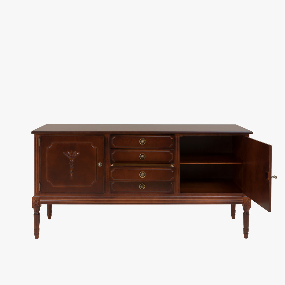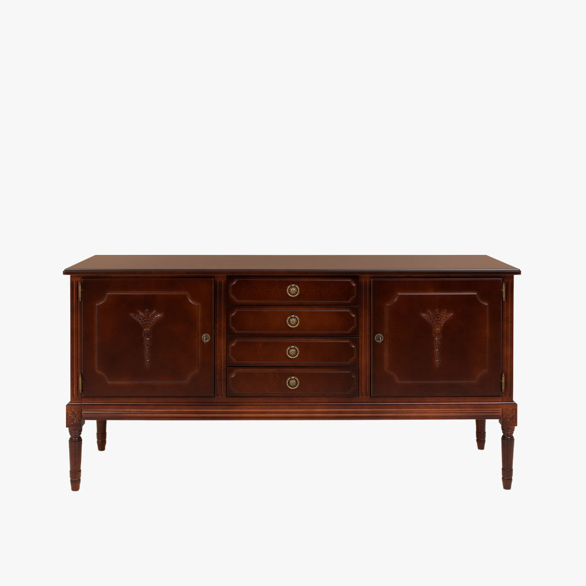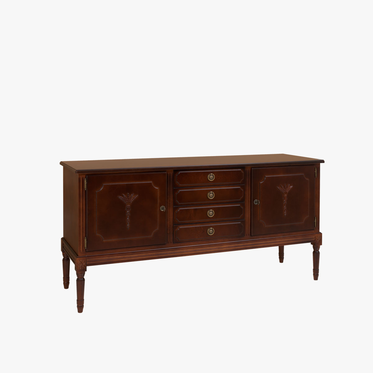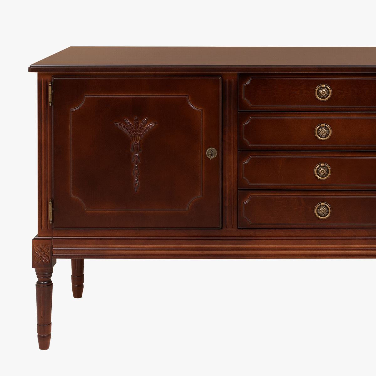 Empiretyylinen matala astiakaappi, jota voisi kutsua myös senkiksi. Astiakaapissa on säilytystilaa kahden kaapin ja neljän laatikon verran. Tämän empiretyylisen säilytyskalusteen kansi toimii työtasona tai laskutilana.