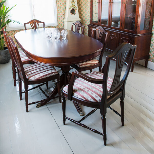 Käytä tuoleja yksittäin tai yhdistä Hepplewhite- tai empireruokapöydän kanssa. Empirekalusteemme soveltuvat hyvin yhteen myös kustavilaisten kalusteiden kanssa.