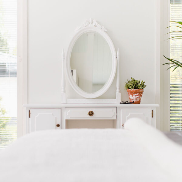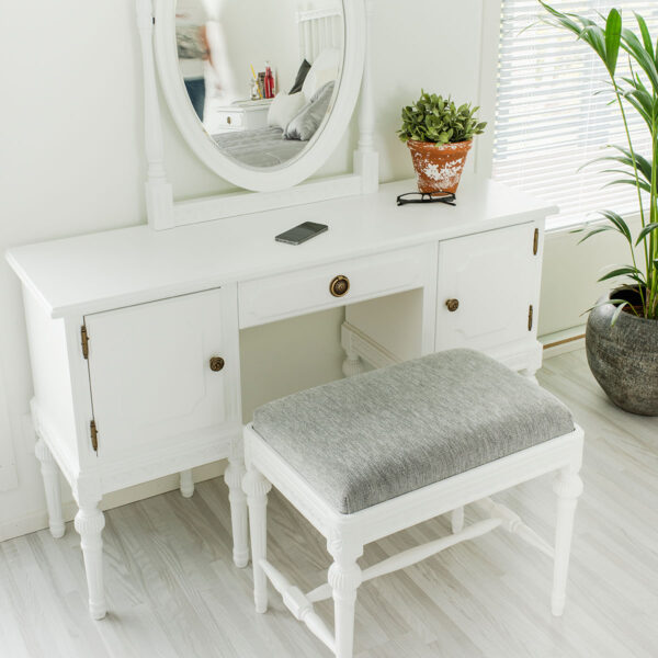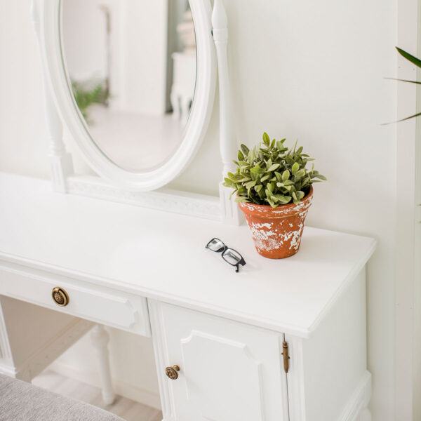 Harvassa ovat ne naiset, jotka eivät jossain vaiheessa elämäänsä olisi toivoneet peilipöytää, jonka voisi pyhittää kauneudenhoidolle. Kustavilainen kampauslipastomme soveltuu sekä meikki- että kampaustarvikkeiden säilyttämiseen että meikkaamiseen ja kampausten tekoon pöydän äärellä. Saranoilla kiinnitettyä ovaalin muotoista peiliä voi käännellä pystysuunnassa.
