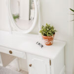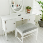 Kustavilaistyylinen, kampaus- tai meikkipöydäksi soveltuva lipasto, jota voisi kutsua myös peilipöydäksi.