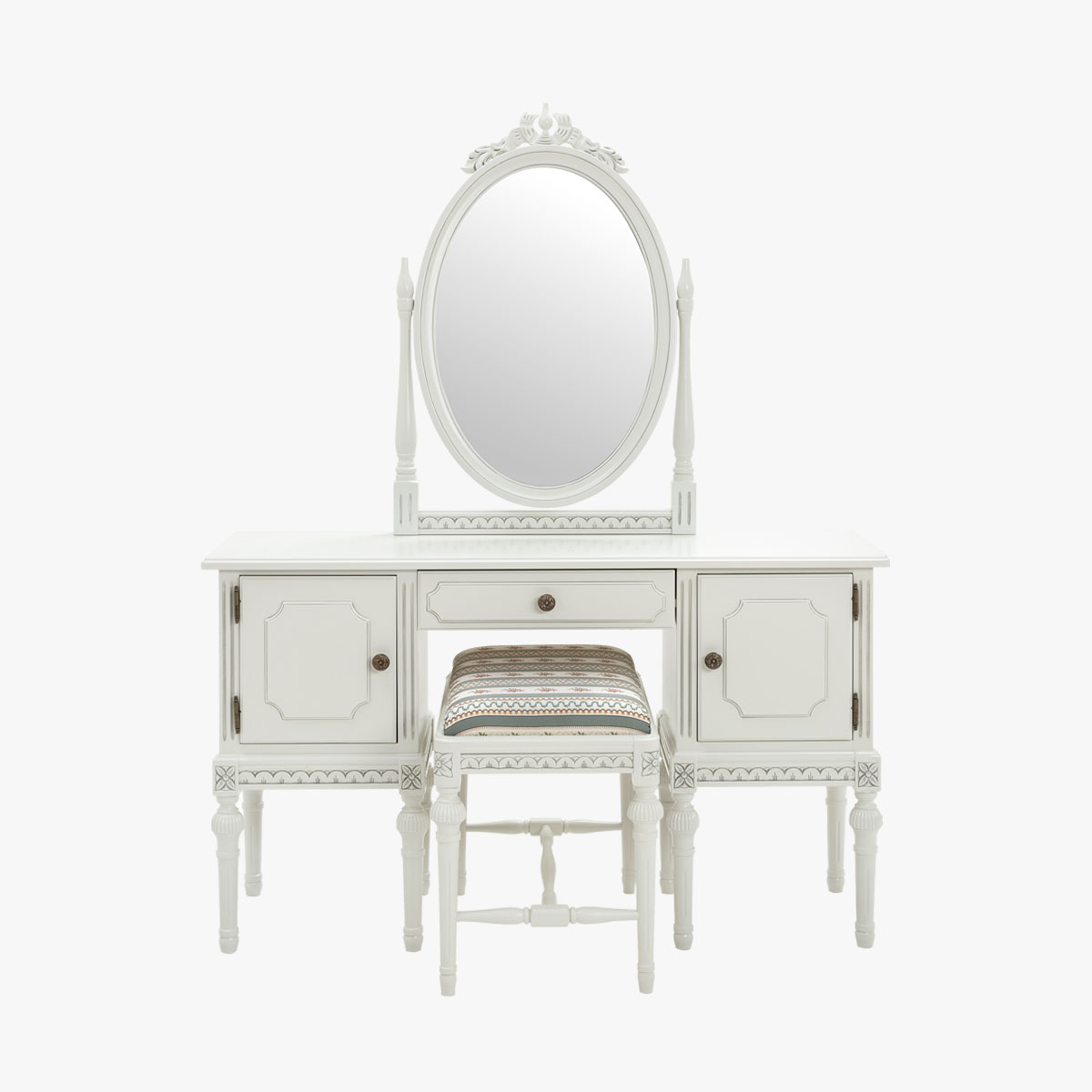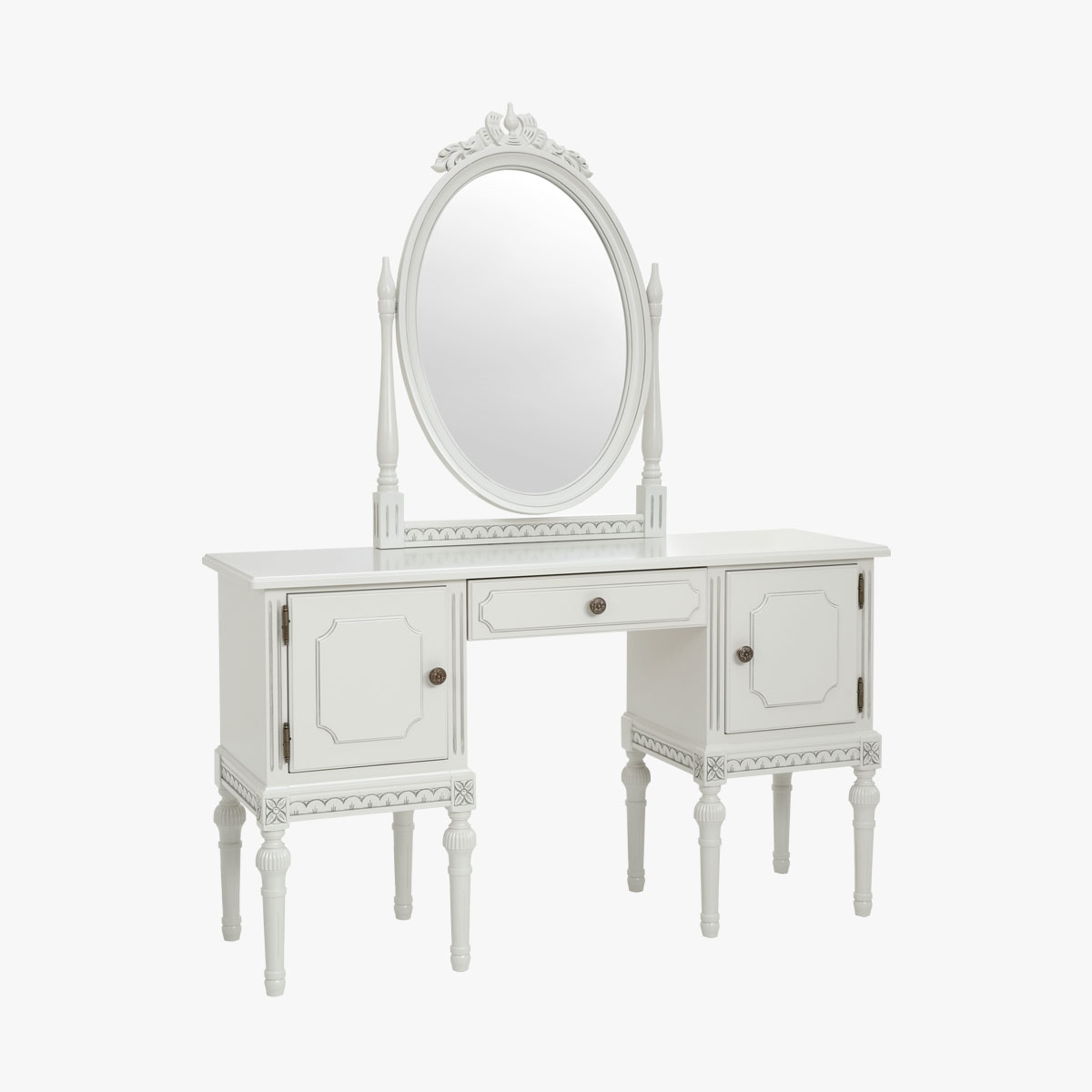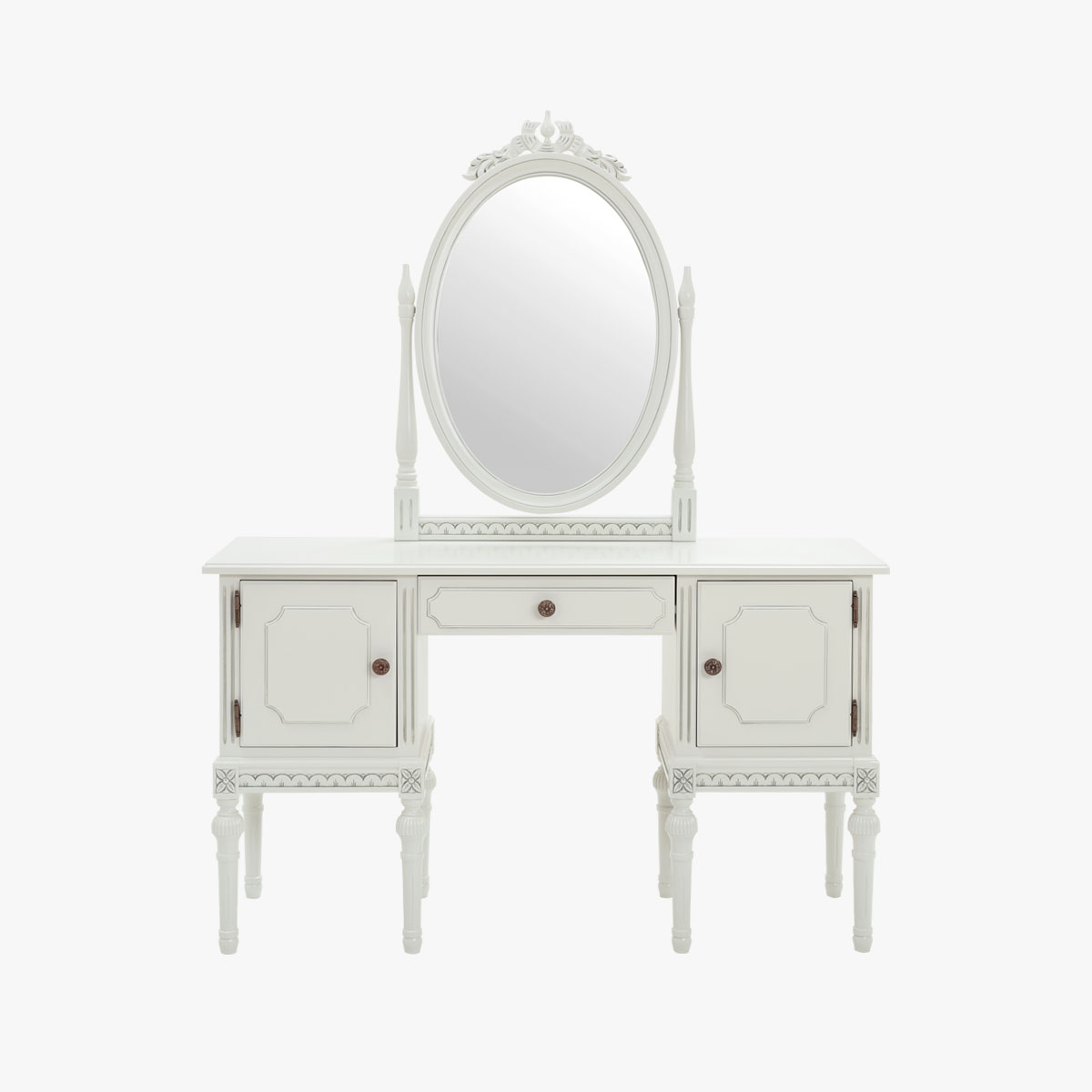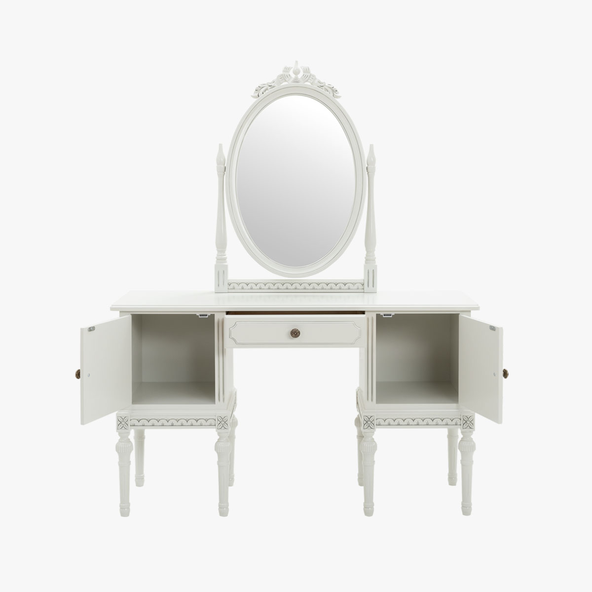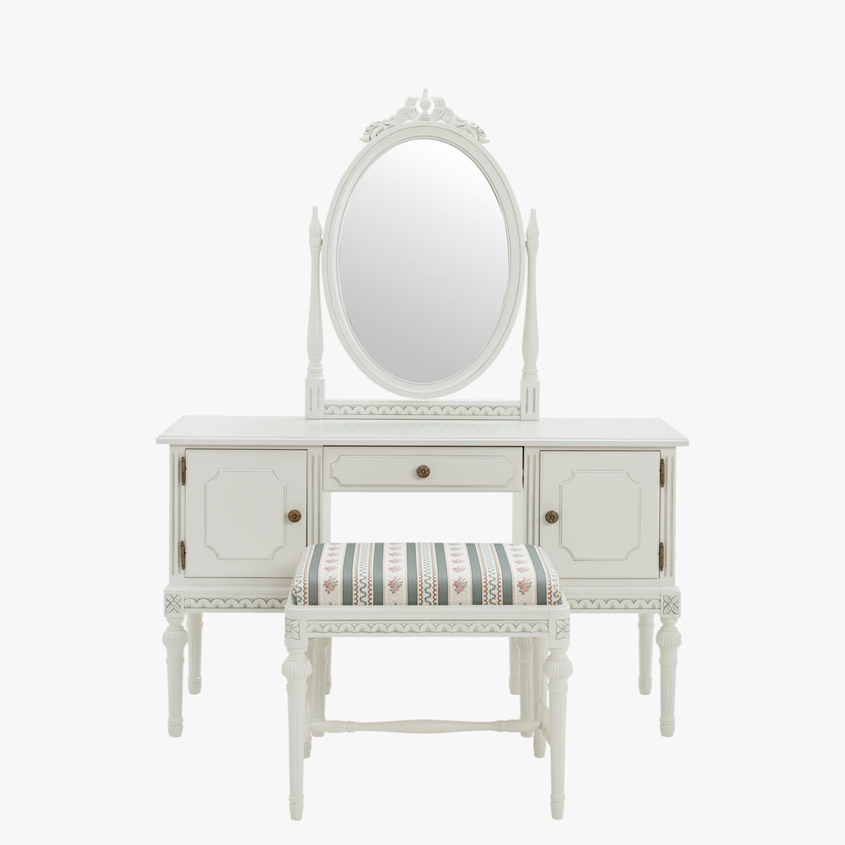 Harvassa ovat ne naiset, jotka eivät jossain vaiheessa elämäänsä olisi toivoneet peilipöytää, jonka voisi pyhittää kauneudenhoidolle. Kustavilainen kampauslipastomme soveltuu sekä meikki- että kampaustarvikkeiden säilyttämiseen että meikkaamiseen ja kampausten tekoon pöydän äärellä. Saranoilla kiinnitettyä ovaalin muotoista peiliä voi käännellä pystysuunnassa.
