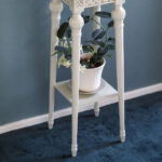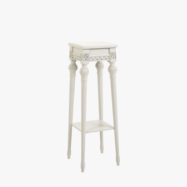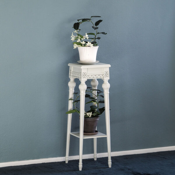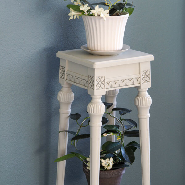 Kustavilaistyyliset, alaspäin kapenevat jalat kallistuvat ulospäin ja muodostavat kukkapylvään kauniin, tornimaisen muodon sekä tekevät pylväästä tukevamman. Ylimmäistä tasoa kiertää kustavilaisia kalusteitamme koristava keisarinlehtikuvio.