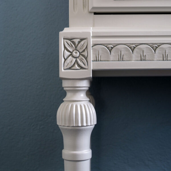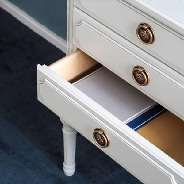 Lipastossa on kolme laatikkoa, joita koristavat kustavilaistyyliset, pyöreät vetimet. Vetimet ovat messingin värisiä ja antiikkipatinoituja.