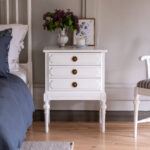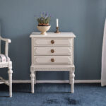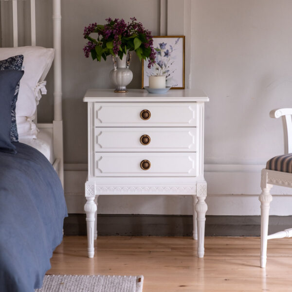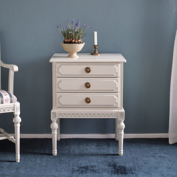 Kustavilaistyylinen kolmilaatikkoinen lipasto, joka soveltuu käytettäväksi myös yöpöytänä.
