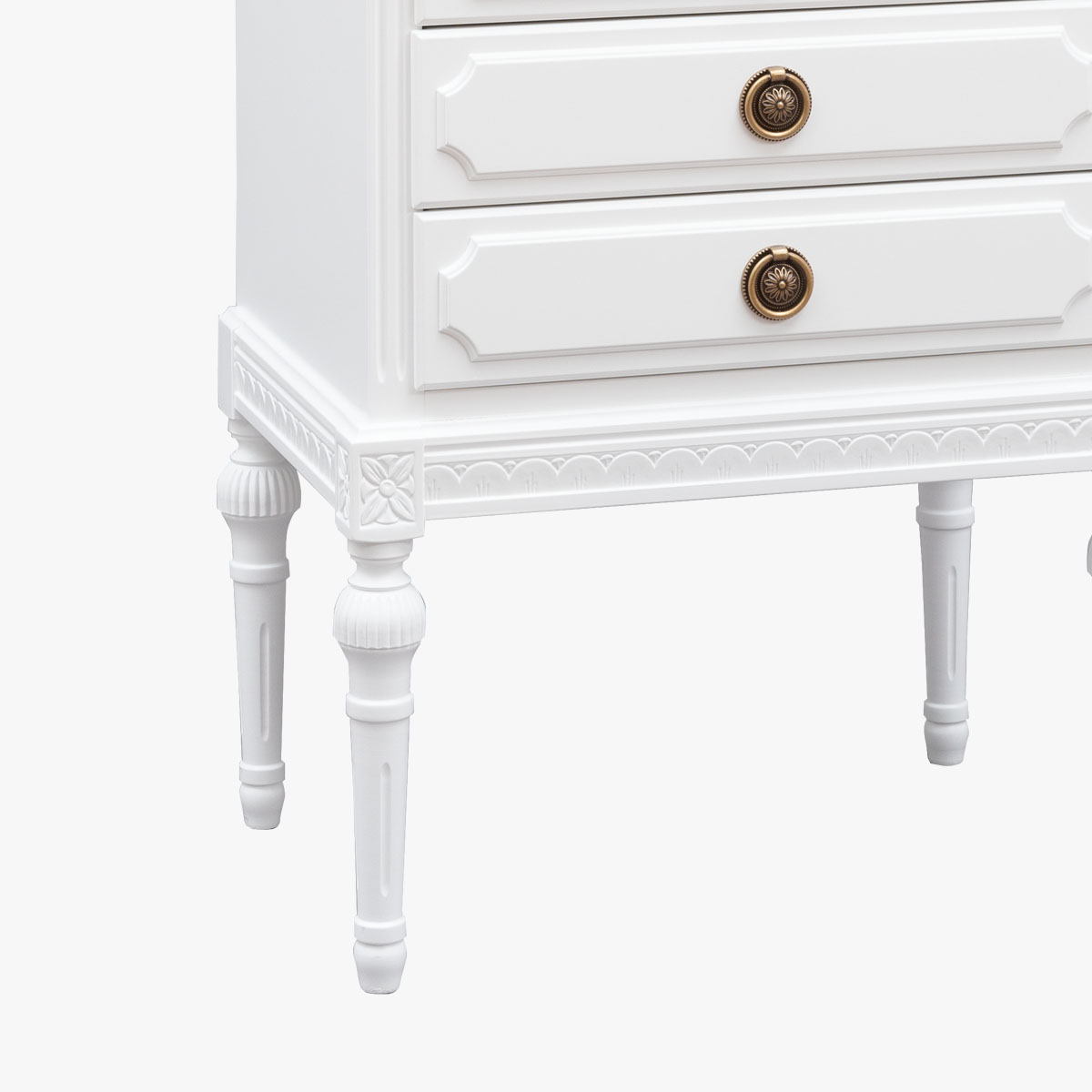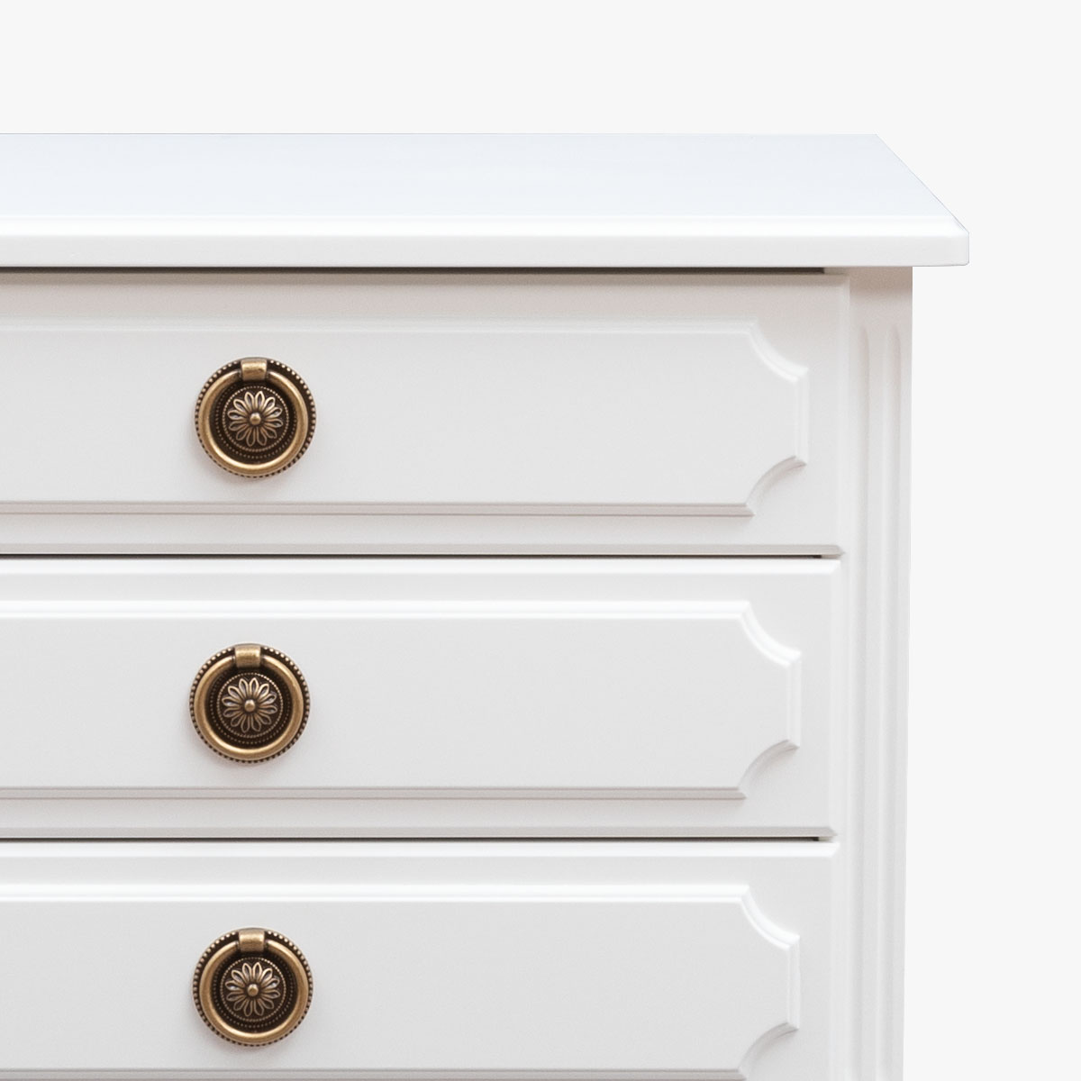 Lipastossa on kolme laatikkoa, joita koristavat kustavilaistyyliset, pyöreät vetimet. Vetimet ovat messingin värisiä ja antiikkipatinoituja.