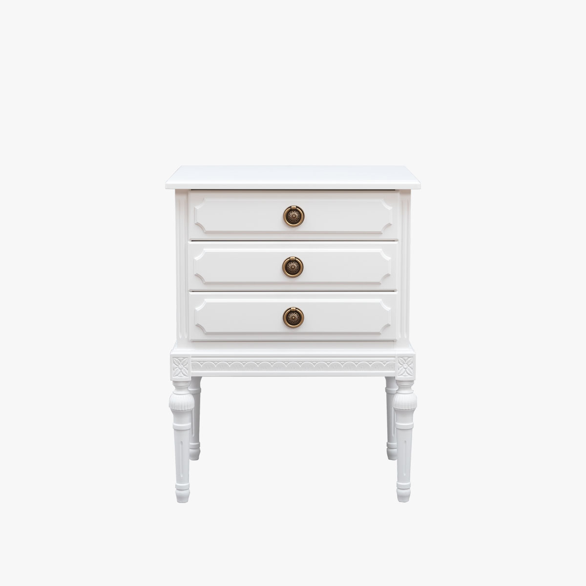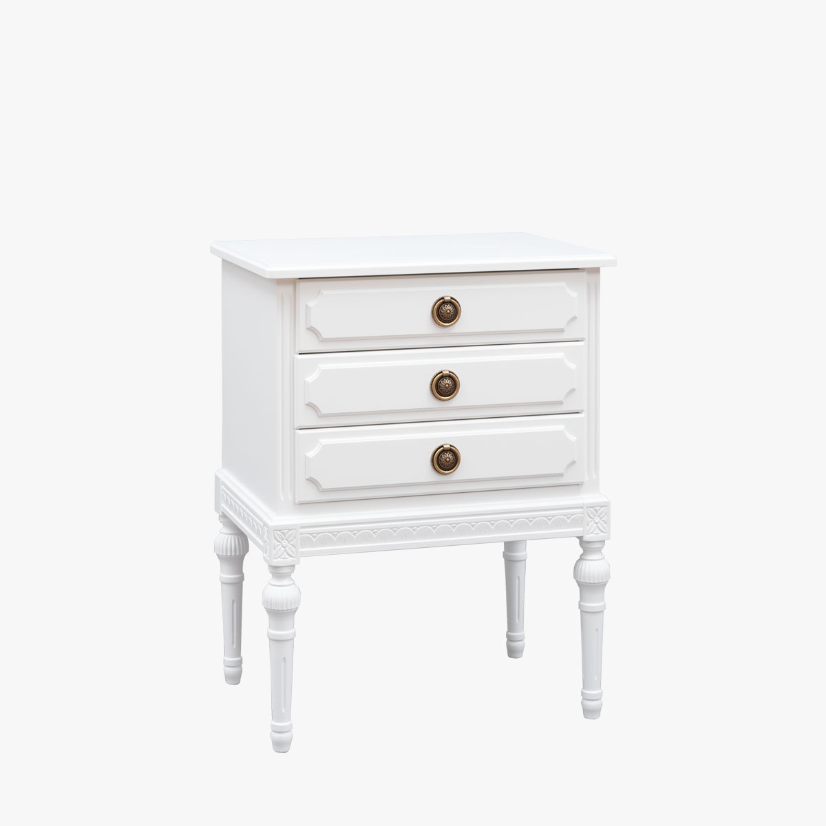 Kustavilaistyylinen kolmilaatikkoinen lipasto, joka soveltuu käytettäväksi myös yöpöytänä.