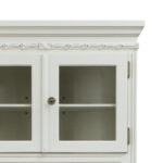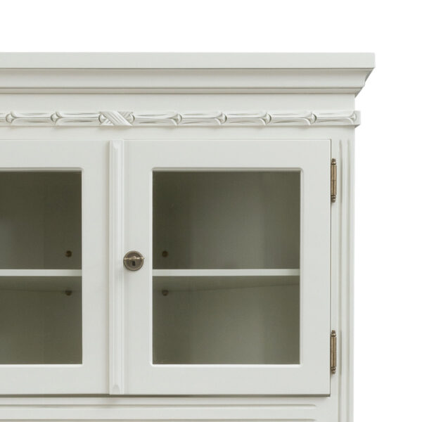 Kaapin yläosassa on lasiovet, joiden takaa löytyy säädettävä hyllylevy. Alla on taso, pienet laatikot ja kaksiovinen kaappi. Yläosan koristelistaa kiertää ornamenttikuvio. Nurkkakaapissa on kolme jalkaa. Laatikoissa on kustavilaistyyliset, antiikkipatinoidut rengasvetimet. Ylä- ja alakaappien ovet ovat lukittavat.