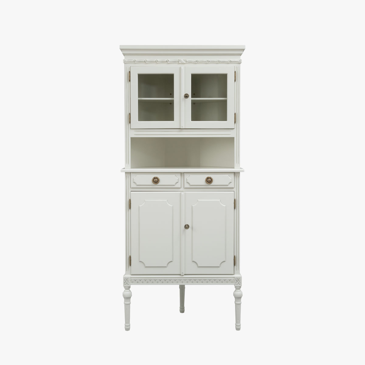 Kaapin yläosassa on lasiovet, joiden takaa löytyy säädettävä hyllylevy. Alla on taso, pienet laatikot ja kaksiovinen kaappi. Yläosan koristelistaa kiertää ornamenttikuvio. Nurkkakaapissa on kolme jalkaa. Laatikoissa on kustavilaistyyliset, antiikkipatinoidut rengasvetimet. Ylä- ja alakaappien ovet ovat lukittavat.