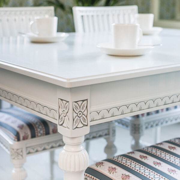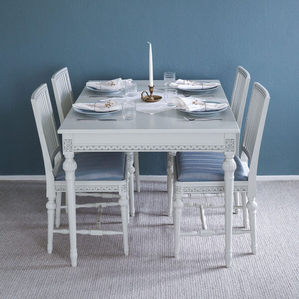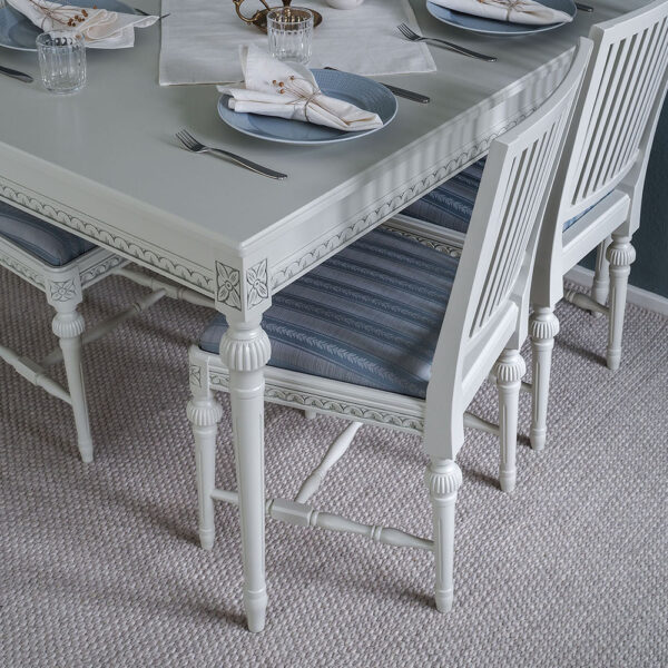 Valitse tämän pöydän kanssa kustavilaiset tuolit ja luo ruokaryhmästä yhtenäinen kokonaisuus, jota yhdistävät samat värit ja kuvioaiheet.