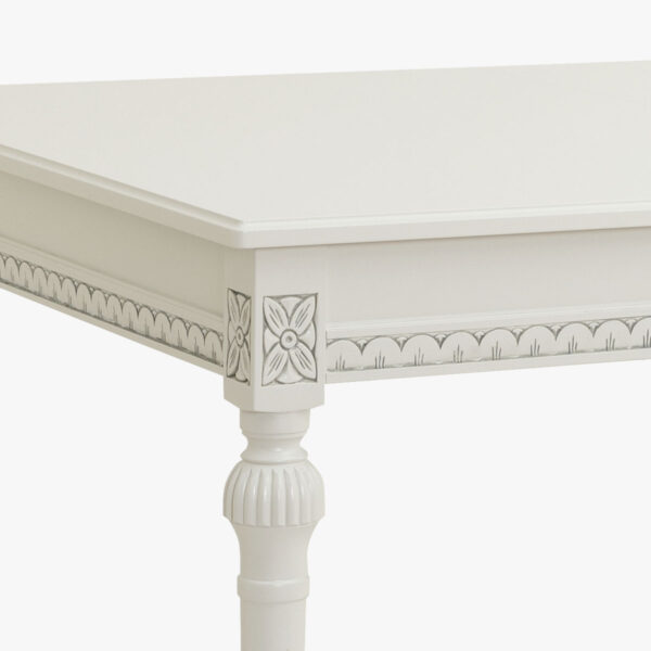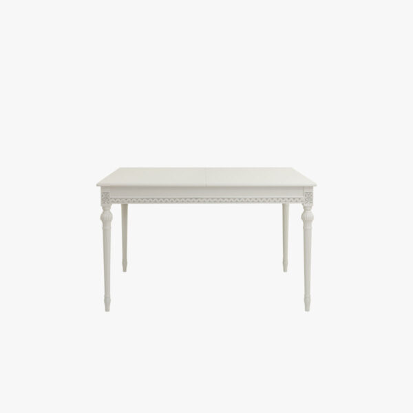 Kustavilaistyylinen, suorakaiteen muotoinen jatkettava ruokapöytä, joka soveltuu parhaiten 4 hengelle, mutta jatkettuna 6 hengelle.
