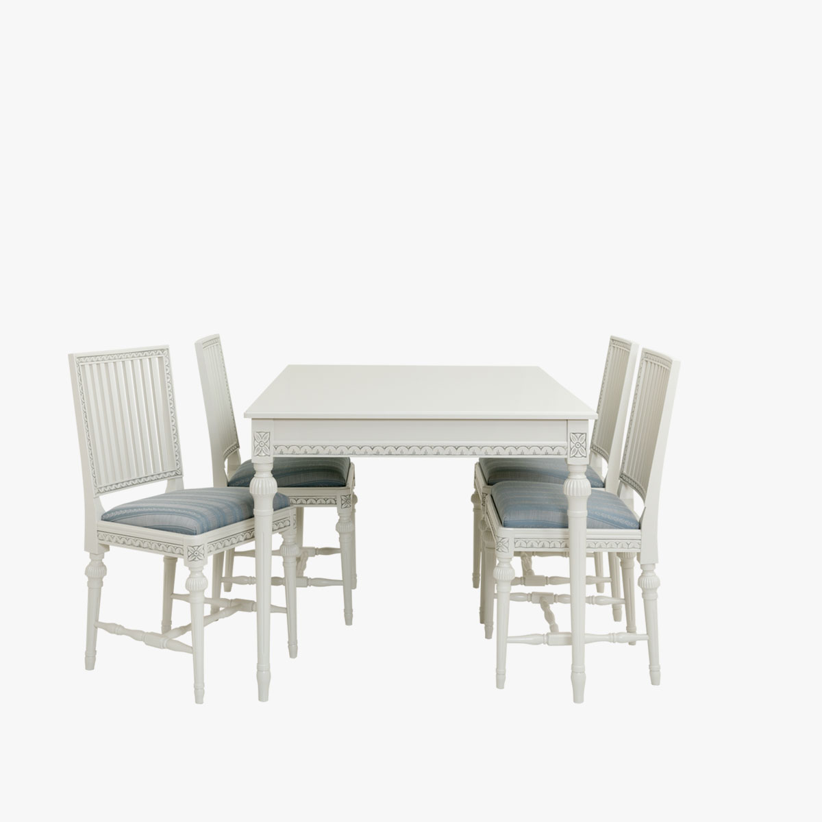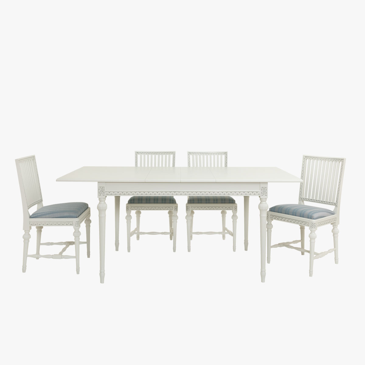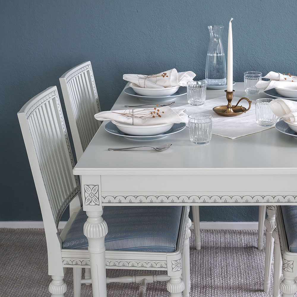 Valitse tämän pöydän kanssa kustavilaiset tuolit ja luo ruokaryhmästä yhtenäinen kokonaisuus, jota yhdistävät samat värit ja kuvioaiheet.