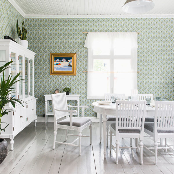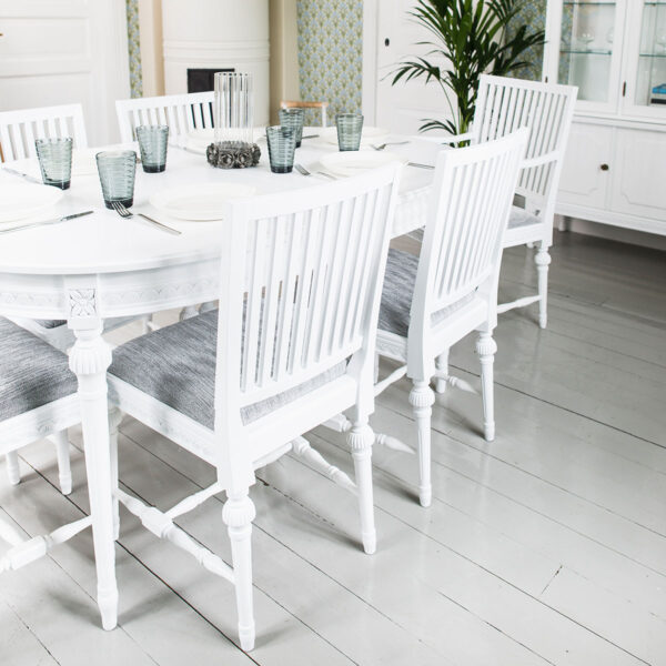 Valitse tämän pöydän kanssa kustavilaiset tuolit ja luo ruokaryhmästä yhtenäinen kokonaisuus, jota yhdistävät samat värit ja kuvioaiheet.
