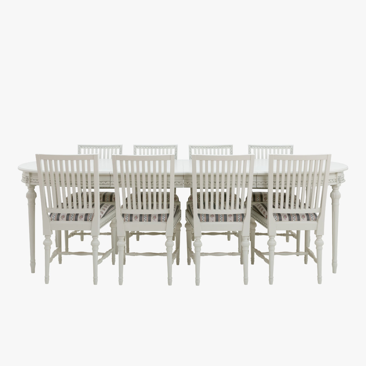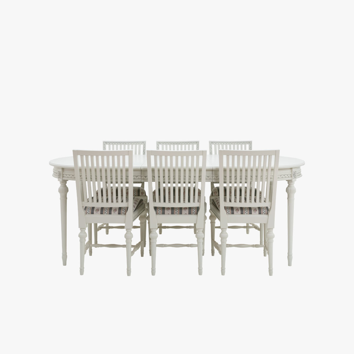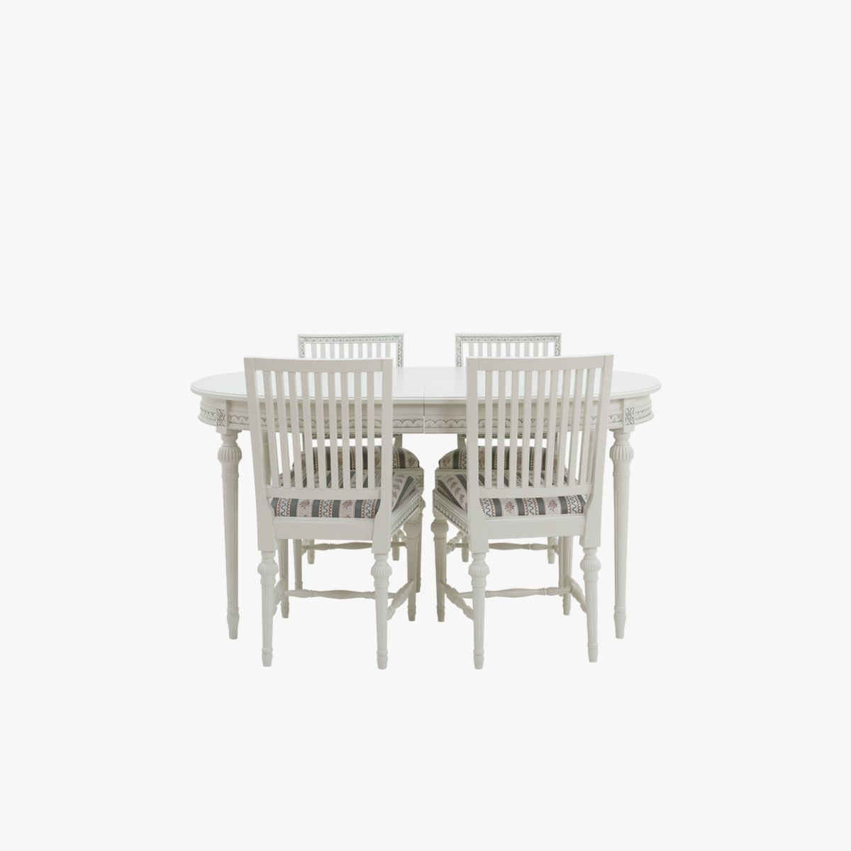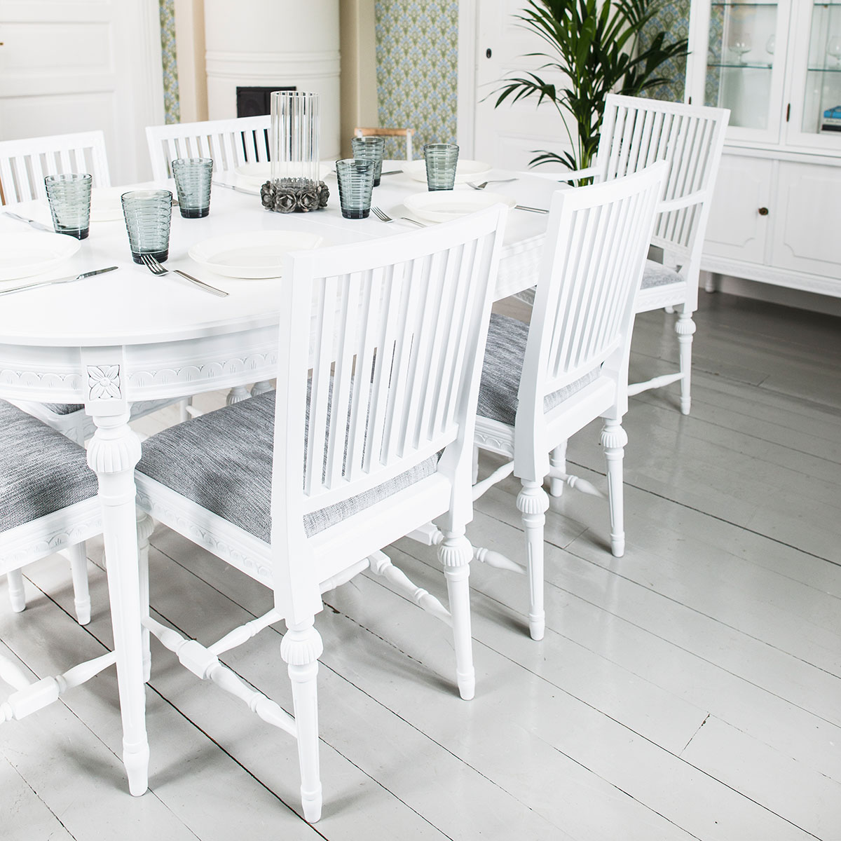 Valitse tämän pöydän kanssa kustavilaiset tuolit ja luo ruokaryhmästä yhtenäinen kokonaisuus, jota yhdistävät samat värit ja kuvioaiheet.