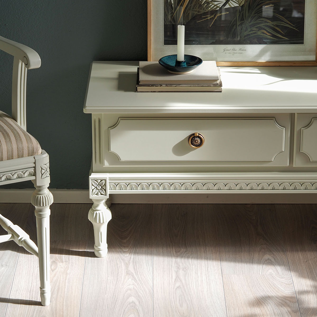 Kustavilaistyylinen matala taso, joka on suunniteltu sijoitettavaksi tv:n alle. Tv-kalusteessa on vasemmalla puolella laatikko ja oikealla puolella klaffiovi, jonka etusarja avautuu alaspäin ja sen takaosassa on reikä johtojen läpivientiä varten. Tason alla olevan klaffioven taakse voi piilottaa pelikonsolin tai muun tv:n luona tarvittavan laitteen. Laitteiden käytön aikana voit pitää luukut auki ja käytön jälkeen piilottaa ne siististi ovien taakse.