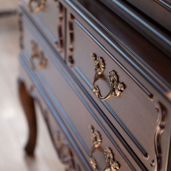 Laadukkaasti viimeisteltyä talonpoikaisrokokoo hopeakaappia koristavat käsin veistetyt yksityiskohdat ja messinginväriset, antiikkipatinoidut helat.
