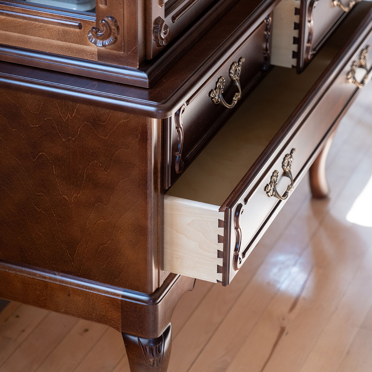 Säilytä juhla-astiasto, pöytähopeat, perintökristallit tai muut kallisarvoiset aarteesi talonpoikaisrokokoo hopeakaapissa.