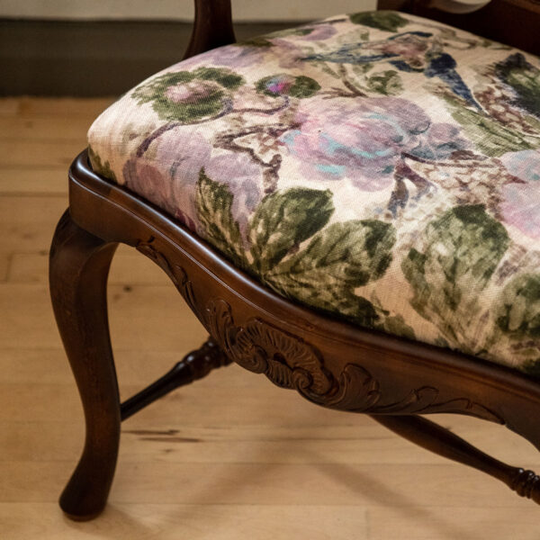 Talonpoikaisrokokoo nojatuoli Lauritzonin Lilyrose 2 -kankaalla verhoiltuna. Erikoiserä tilauskankaalla, jota ei ole saatavilla vakiomallistossamme.