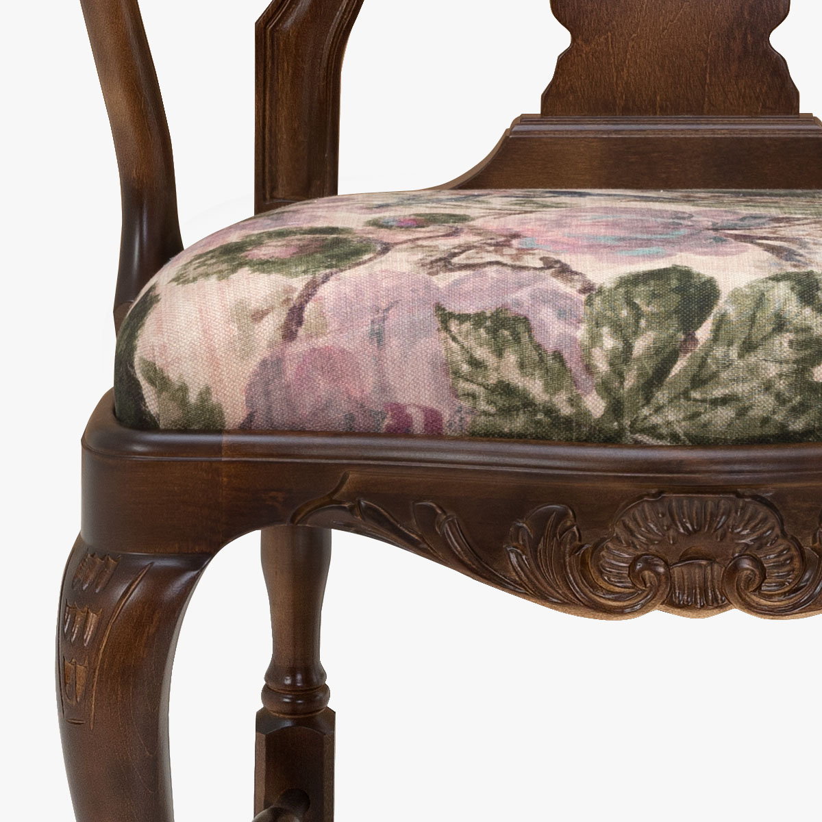 Talonpoikaisrokokoo nojatuoli Lauritzonin Lilyrose 2 -kankaalla verhoiltuna. Erikoiserä tilauskankaalla, jota ei ole saatavilla vakiomallistossamme.