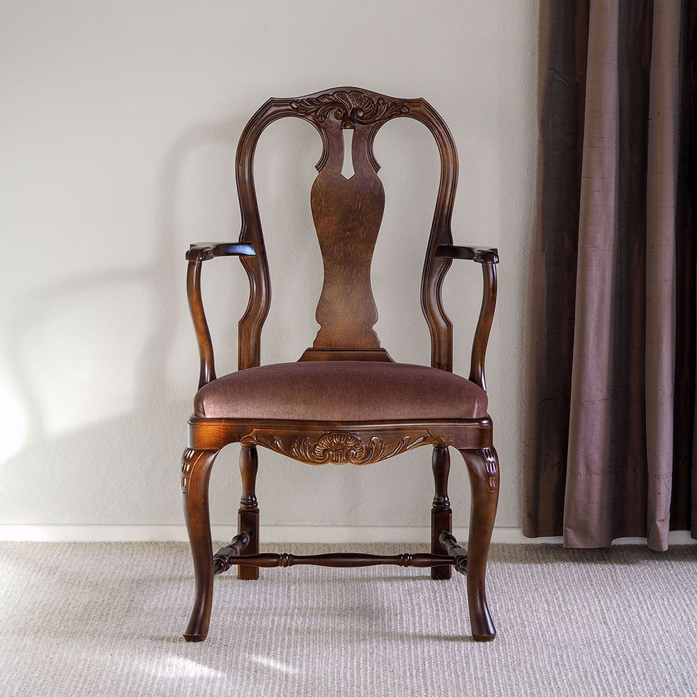 Talonpoikaisrokokoo nojatuoli on hyvä valinta, jos kaipaat tukevaa käsinojallista tuolia, jossa on pehmustettu ja kevyesti joustava istuinosa.