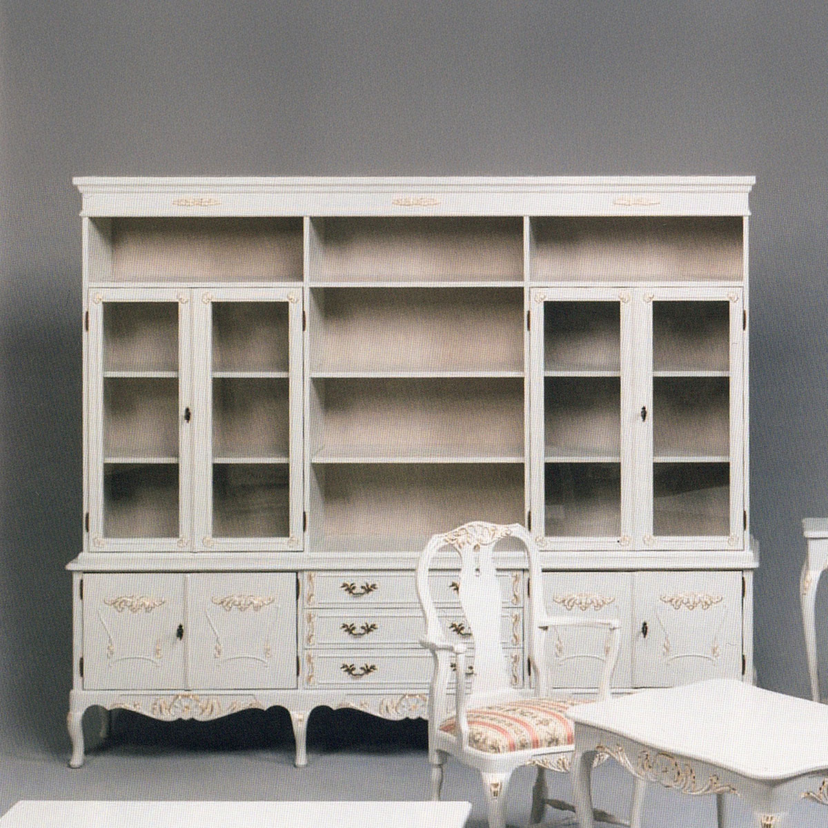 Laadukkaasti viimeisteltyä talonpoikaisrokokoo kirjahyllyä koristavat käsin veistetyt yksityiskohdat ja messingin väriset, antiikkipatinoidut helat.
