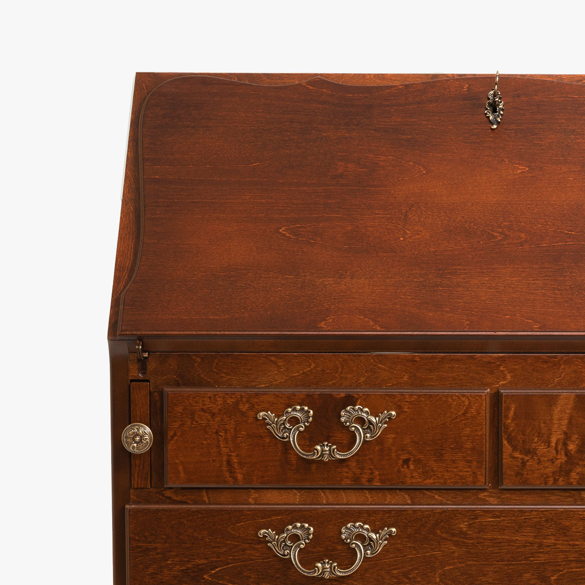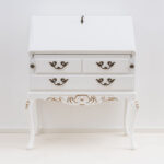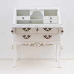 Talonpoikaisrokokoo kirjoituslipasto, toiselta nimeltään klaffilipasto, sisältää sekä säilytystilaa että pienen työskentelyyn sopivan tason.