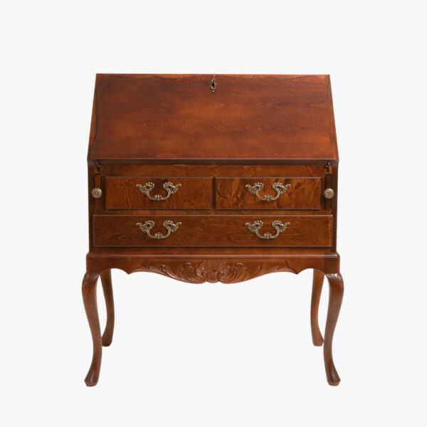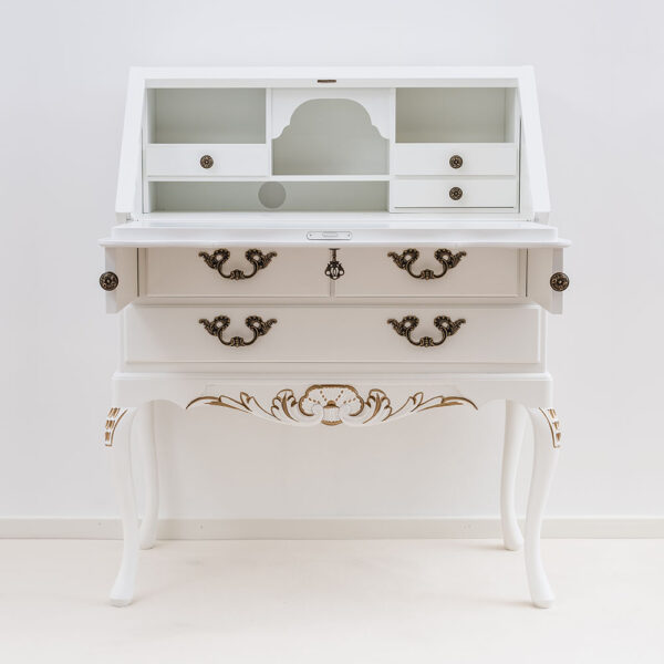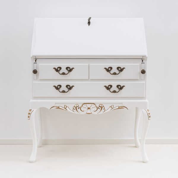 Talonpoikaisrokokootyylisessä kirjoituslipastossa on kaartuvat jalat ja käsin veistetyt yksityiskohdat. Sitä koristavat rokokoolle tyypilliset kuvioaiheet, kuten rocaille-kuvio eli näkinkenkä, kuten meillä Laitalassa kuviota kutsutaan. Laatikoissa on rokokoo-tyyliset messingin väriset, antiikkipatinoidut vetimet. Myös muut kalusteen muut helat ovat antiikkipatinoidut. Klaffiosa on lukittava.