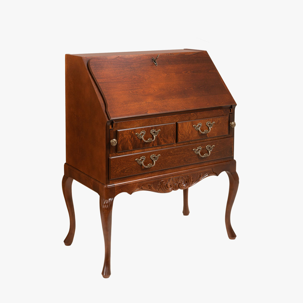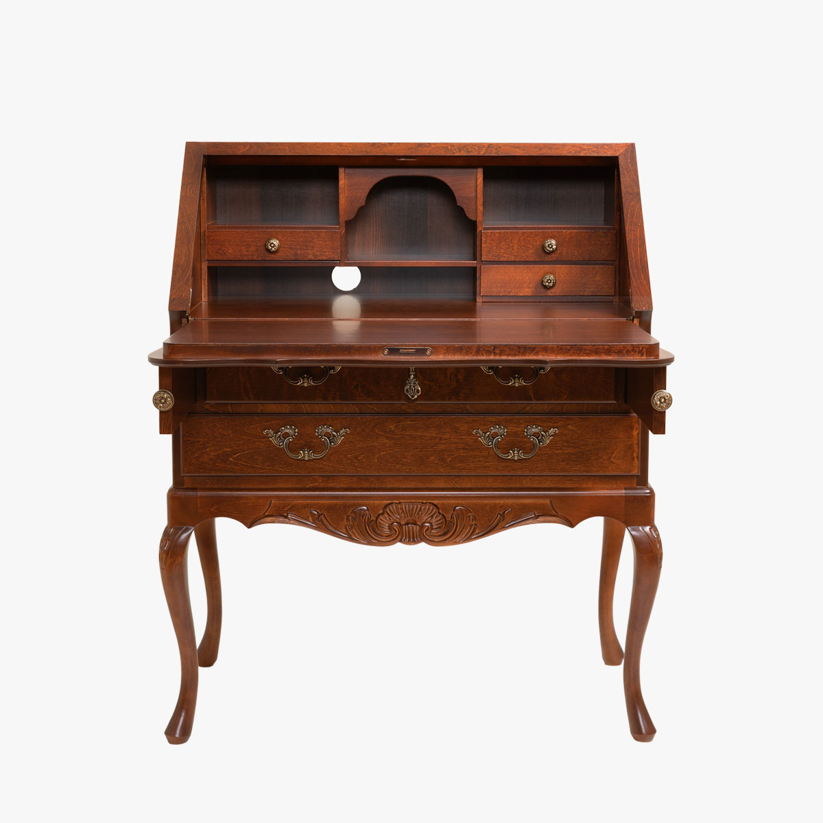 Talonpoikaisrokokootyylisessä kirjoituslipastossa on kaartuvat jalat ja käsin veistetyt yksityiskohdat. Sitä koristavat rokokoolle tyypilliset kuvioaiheet, kuten rocaille-kuvio eli näkinkenkä, kuten meillä Laitalassa kuviota kutsutaan. Laatikoissa on rokokoo-tyyliset messingin väriset, antiikkipatinoidut vetimet. Myös muut kalusteen muut helat ovat antiikkipatinoidut. Klaffiosa on lukittava.