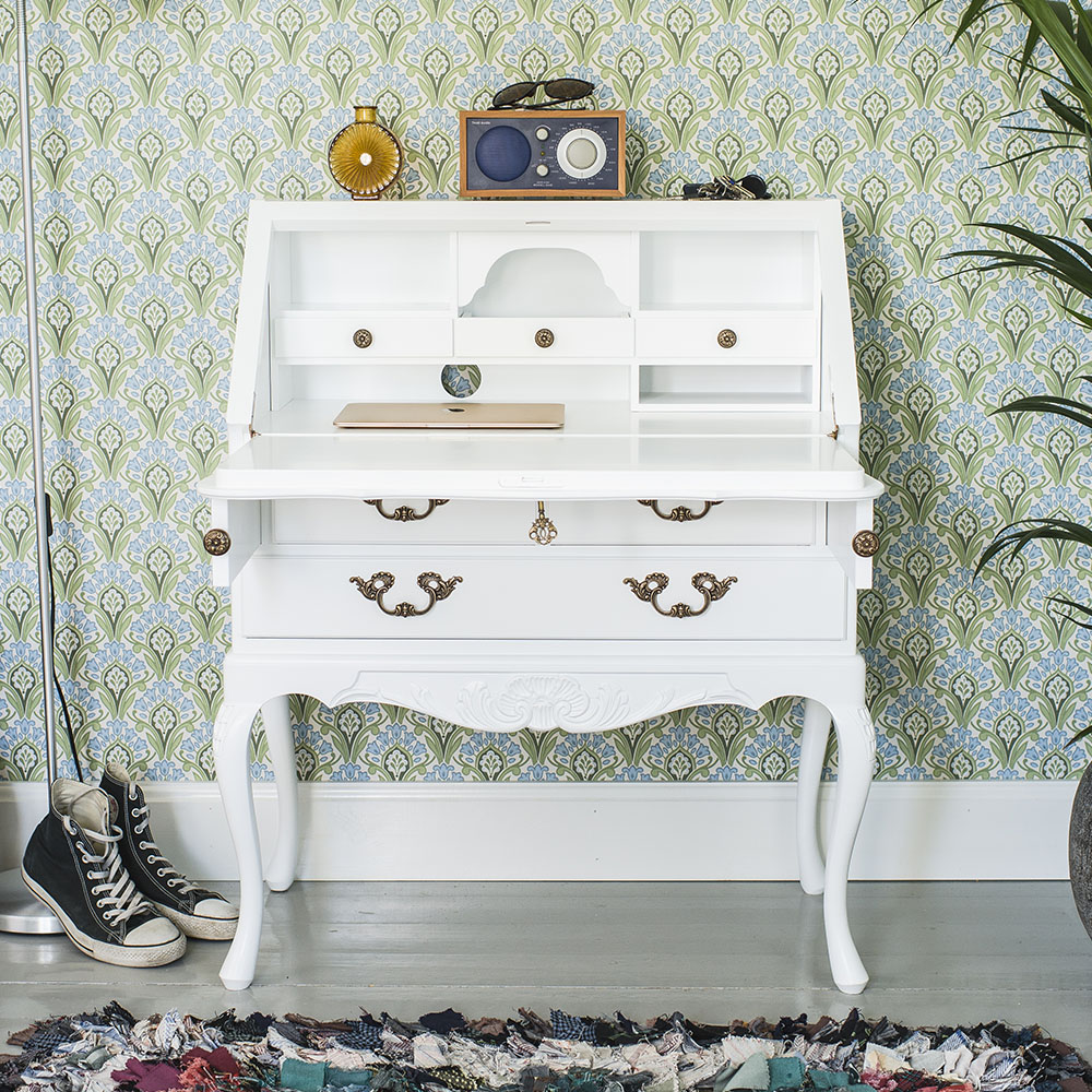 Voit tehdä klaffilipastosta kodin pienen työpisteen, jossa tehdä paperityöt ja säilyttää tärkeät paperit. Kirjoituslipasto kätkee sisälleen säilytystilan myös kannettavalle tietokoneelle ja johtojen läpiviennille kalusteen taa.