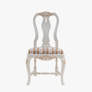 Pieni talonpoikaisrokokootyylinen rahi, jossa on verhoiltu istuinosa ja käsin veistetyt koristekuviot. Saatavilla useita väri- ja verhoiluvaihtoehtoja.