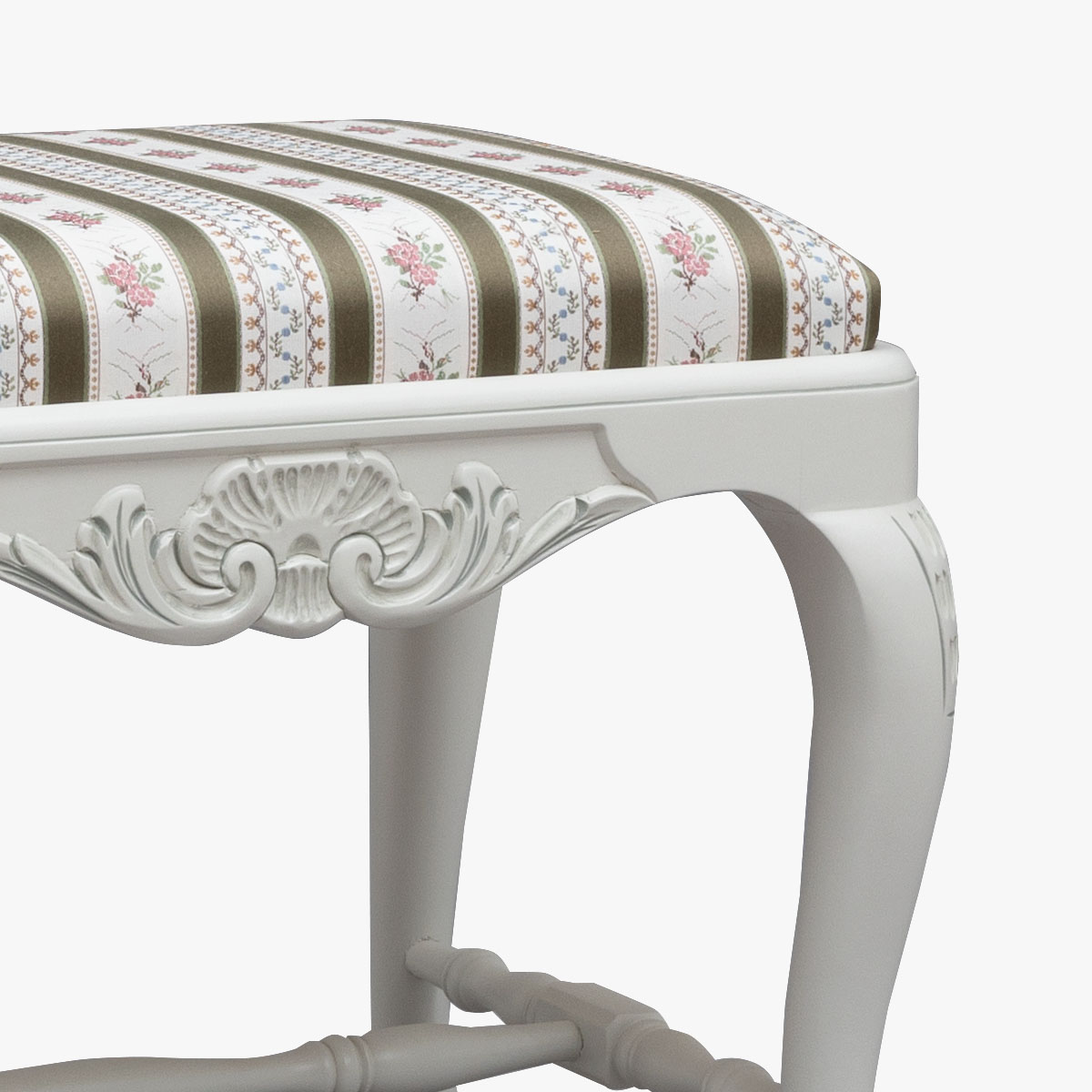 Pieni talonpoikaisrokokootyylinen rahi, jossa on verhoiltu istuinosa ja käsin veistetyt koristekuviot. Saatavilla useita väri- ja verhoiluvaihtoehtoja.