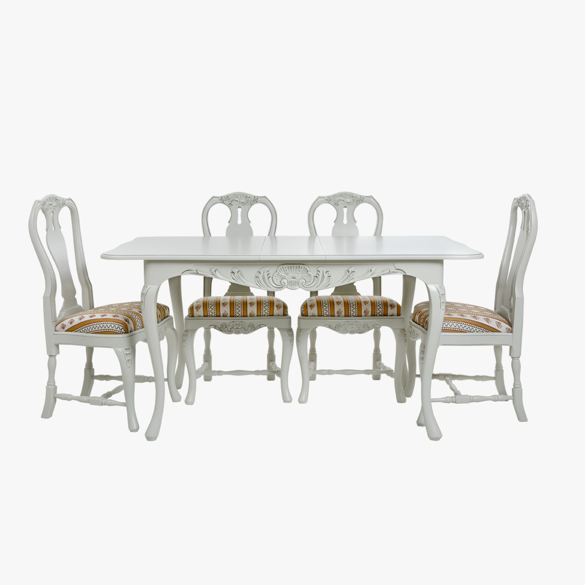 Valitse tämän pöydän kanssa talonpoikaisrokokoo tuolit ja luo ruokaryhmästä yhtenäinen kokonaisuus, jota yhdistävät samat värit ja kuvioaiheet.