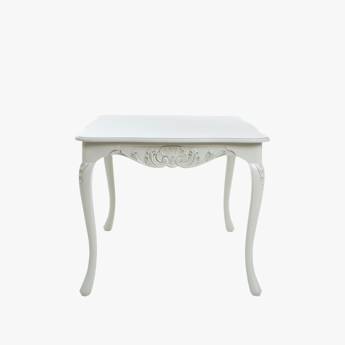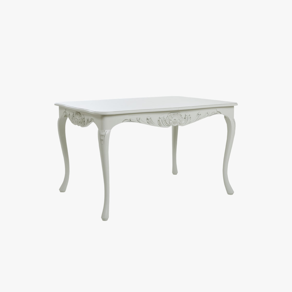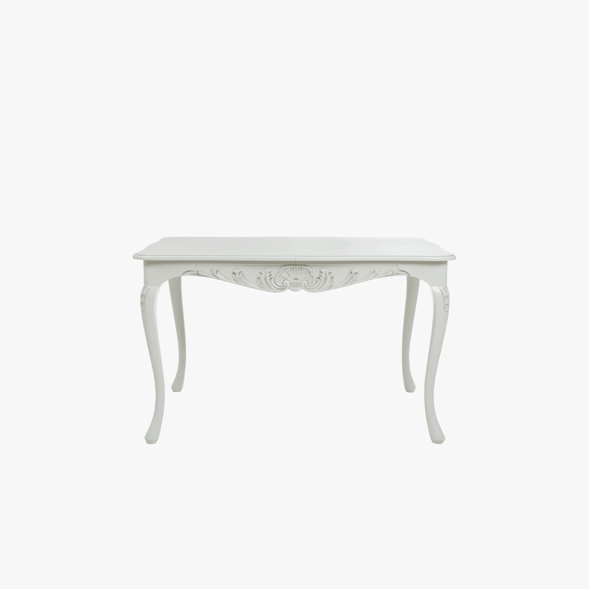 Talonpoikaisrokokootyylinen, suorakaiteen muotoinen jatkettava ruokapöytä, joka soveltuu parhaiten 4 hengelle, mutta jatkopaloilla pöydän ympärille mahtuu 6 henkeä.