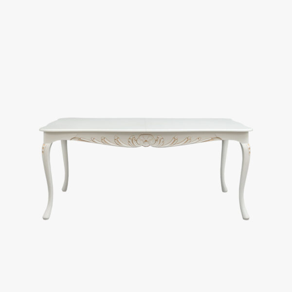 Talonpoikaisrokokootyylinen, suorakaiteen muotoinen jatkettava ruokapöytä, joka soveltuu parhaiten 6 hengelle, mutta jatkettuna 8 hengelle.