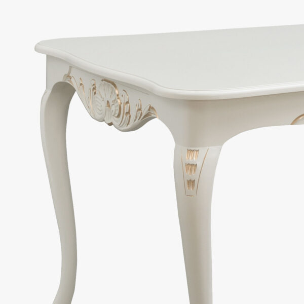 Suorakaiteen muotoisessa ruokapöydässä on rokokootyylille tunnusomaiset kaarevat jalat, pyöreät muodot ja luontoaiheiset, käsin veistetyt koristekuviot. Pöytää kiertävien koristekuvioiden keskellä on simpukkaornamentti eli rocaille-kuvio, jota reunustavat lehtiornamentit.