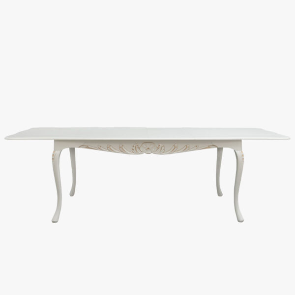 Tämä suorakaiteen muotoinen talonpoikaisrokokootyylinen ruokapöytä soveltuu 6 henkilölle ja muuntuu jatkopalojen avulla ruokapöydäksi 8 henkilölle. Jatkopaloja voi säilyttää kätevästi pöydän kannen sisällä silloin, kun ne eivät ole käytössä. Jatkettava ruokapöytä on käytännöllinen ja pitkäikäinen hankinta, koska se muuntuu elämäntilanteen ja ruokailijamäärän mukaan.