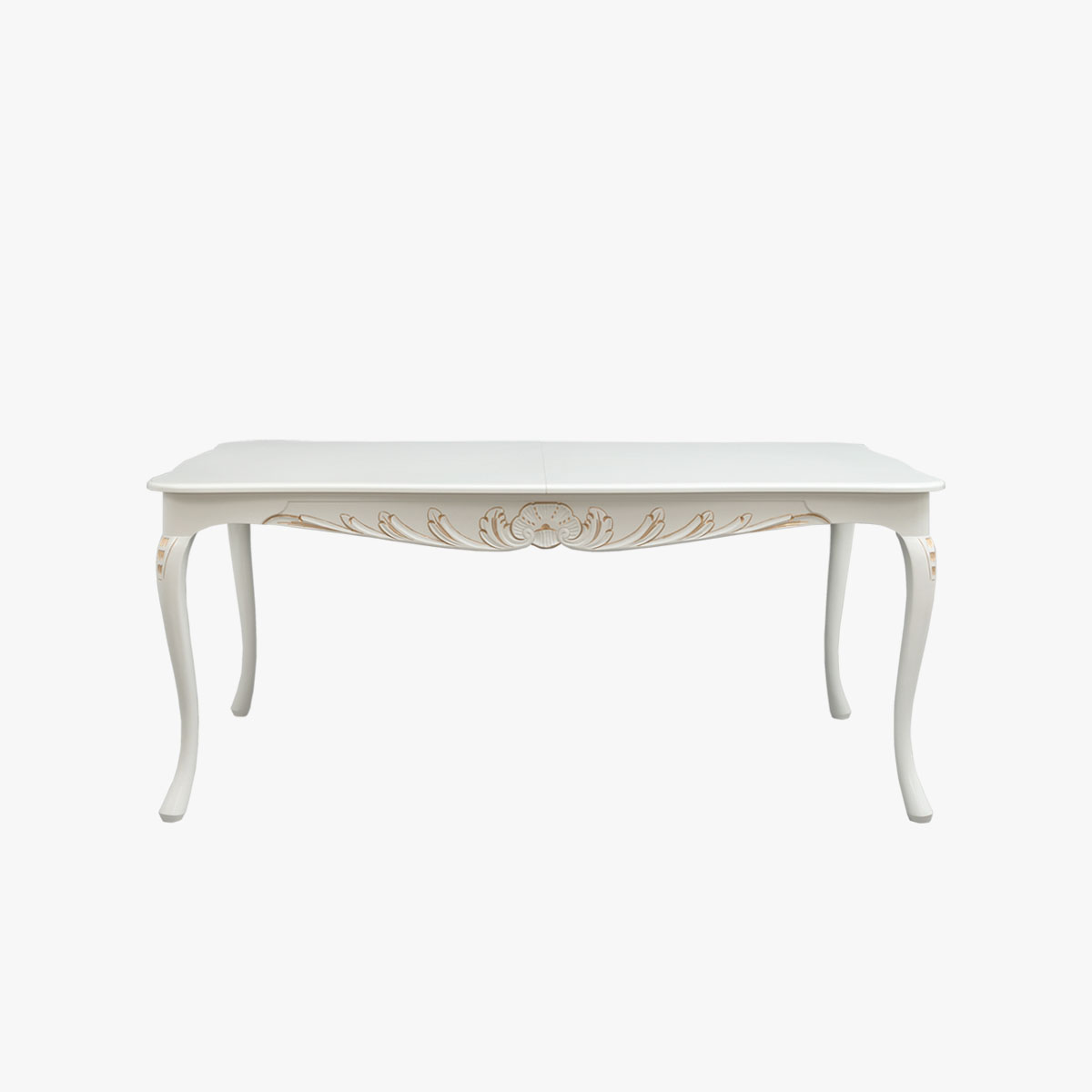 Tämä suorakaiteen muotoinen talonpoikaisrokokootyylinen ruokapöytä soveltuu 6 henkilölle ja muuntuu jatkopalojen avulla ruokapöydäksi 8 henkilölle. Jatkopaloja voi säilyttää kätevästi pöydän kannen sisällä silloin, kun ne eivät ole käytössä. Jatkettava ruokapöytä on käytännöllinen ja pitkäikäinen hankinta, koska se muuntuu elämäntilanteen ja ruokailijamäärän mukaan.