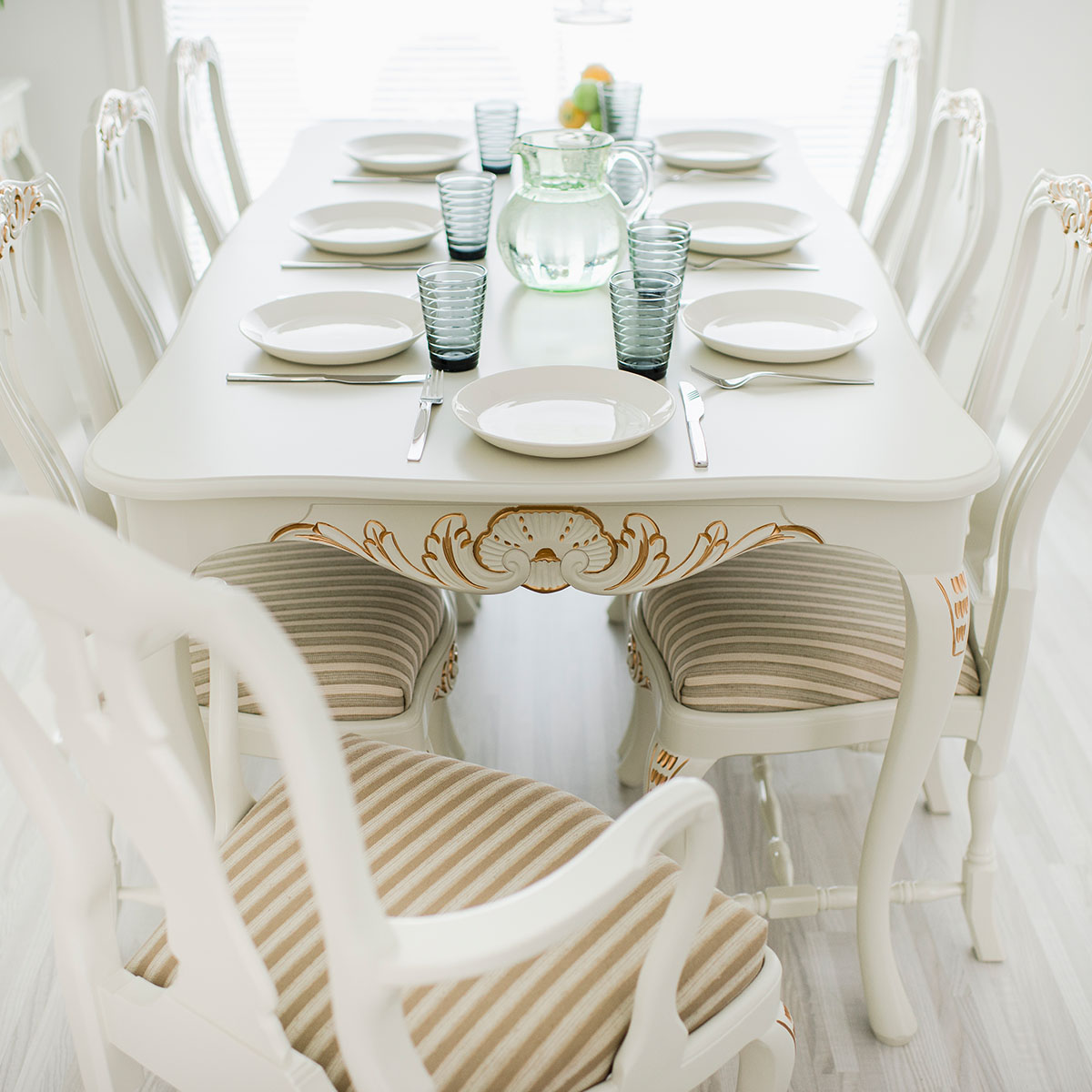 Suorakaiteen muotoinen talonpoikaisrokokooruokapöytä on ruokasalin helmi!