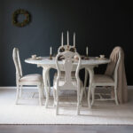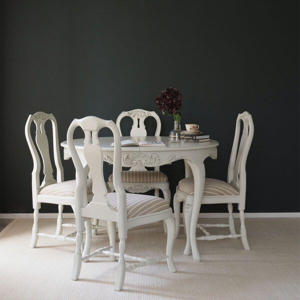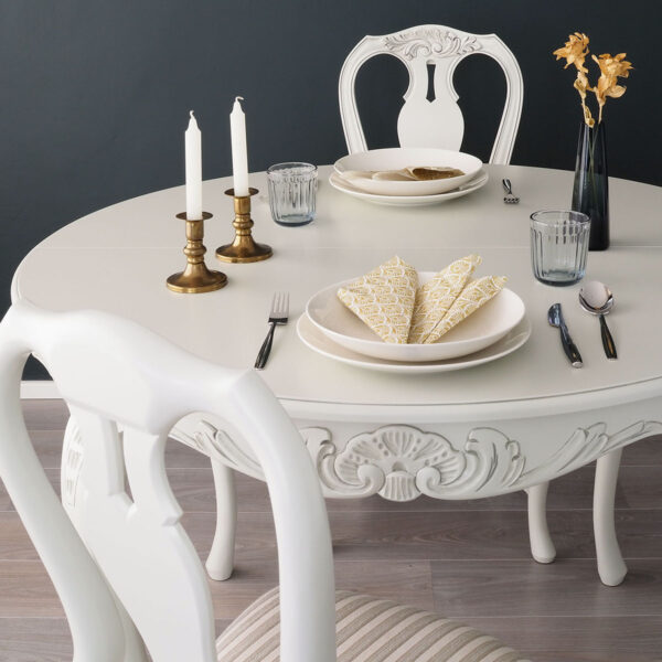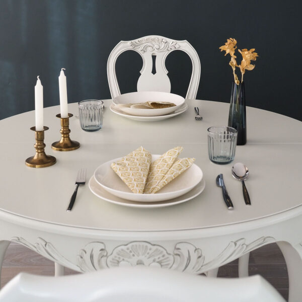 Talonpoikaisrokokooruokapöytä on ruokasalin helmi! Elegantti, talonpoikaisrokokootyylinen pyöreä ruokapöytä tuo kotiisi 1700-luvun rokokootyyliä.