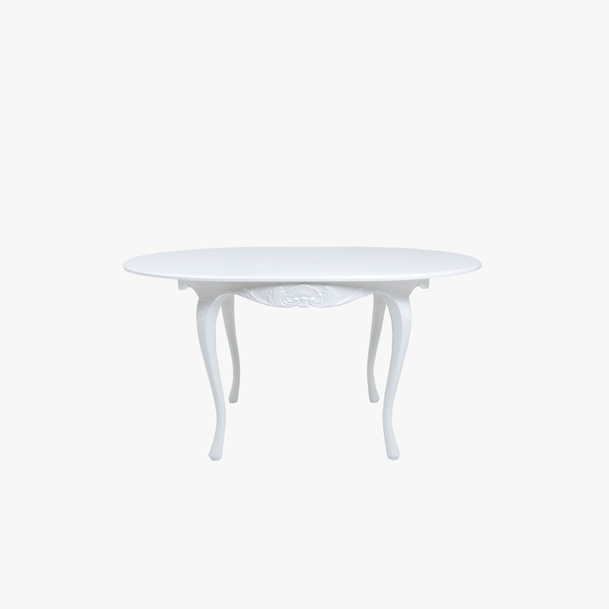 Tämä pyöreä talonpoikaisrokokootyylinen ruokapöytä soveltuu 2-4 henkilölle. Pöytä kasvaa jatkolevyn avulla ovaalin muotoiseksi, silloin kun kattaukselle tarvitaan enemmän tilaa. Jatkettunakin pöytä on ihanteellinen 2-4 henkilölle, koska pöytää jatkettaessa sen jalat eivät siirry vaan ainoastaan kannen koko kasvaa.