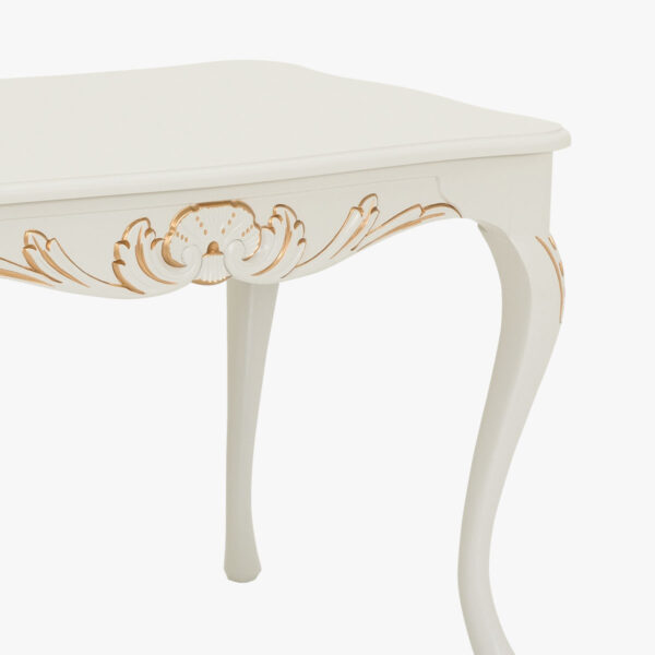 Suorakaiteen muotoisessa sohvapöydässä on rokokootyylille tunnusomaiset kaarevat jalat, pyöreät muodot ja luontoaiheiset, käsin veistetyt koristekuviot. Pöytää kiertävien koristekuvioiden keskellä on simpukkaornamentti eli rocaille-kuvio, jota reunustavat lehtiornamentit.