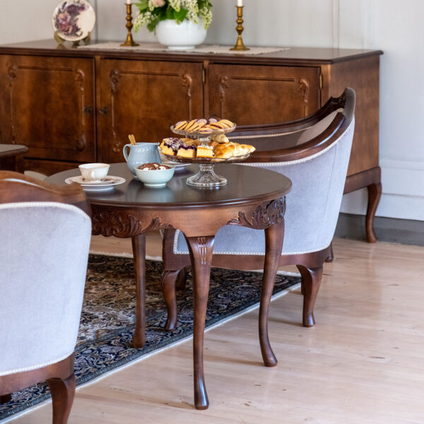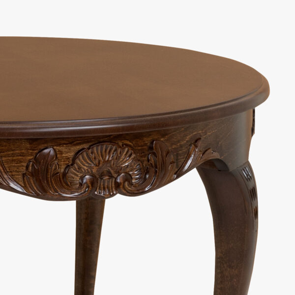 Pyöreä talonpoikaisrokokootyylinen sohvapöytä, jossa on käsin veistetyt yksityiskohdat.