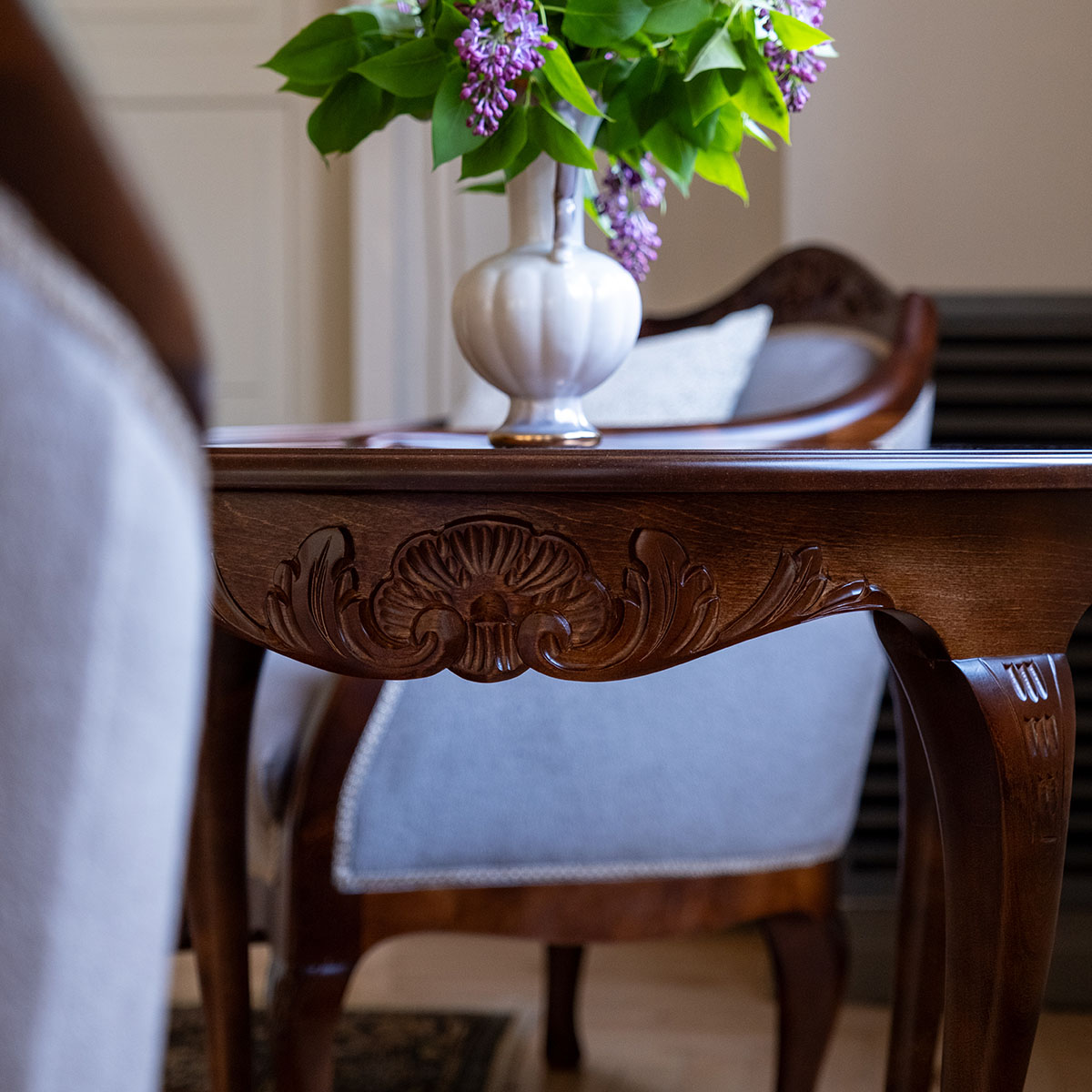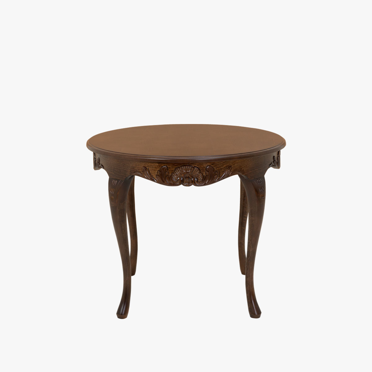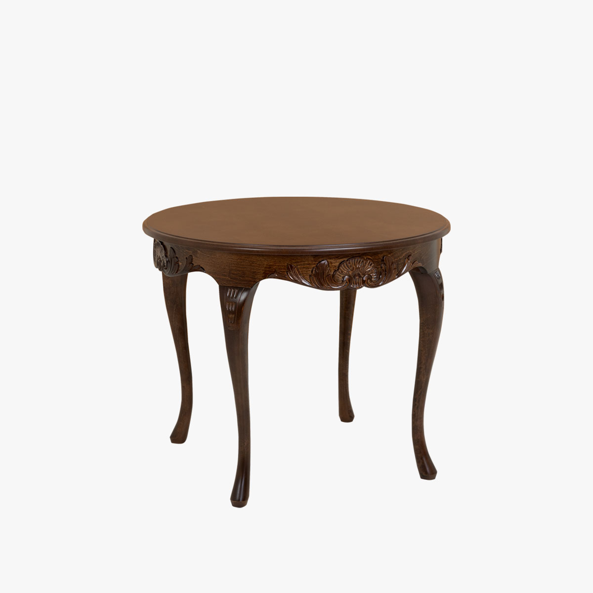 Pyöreä talonpoikaisrokokootyylinen sohvapöytä, jossa on käsin veistetyt yksityiskohdat.