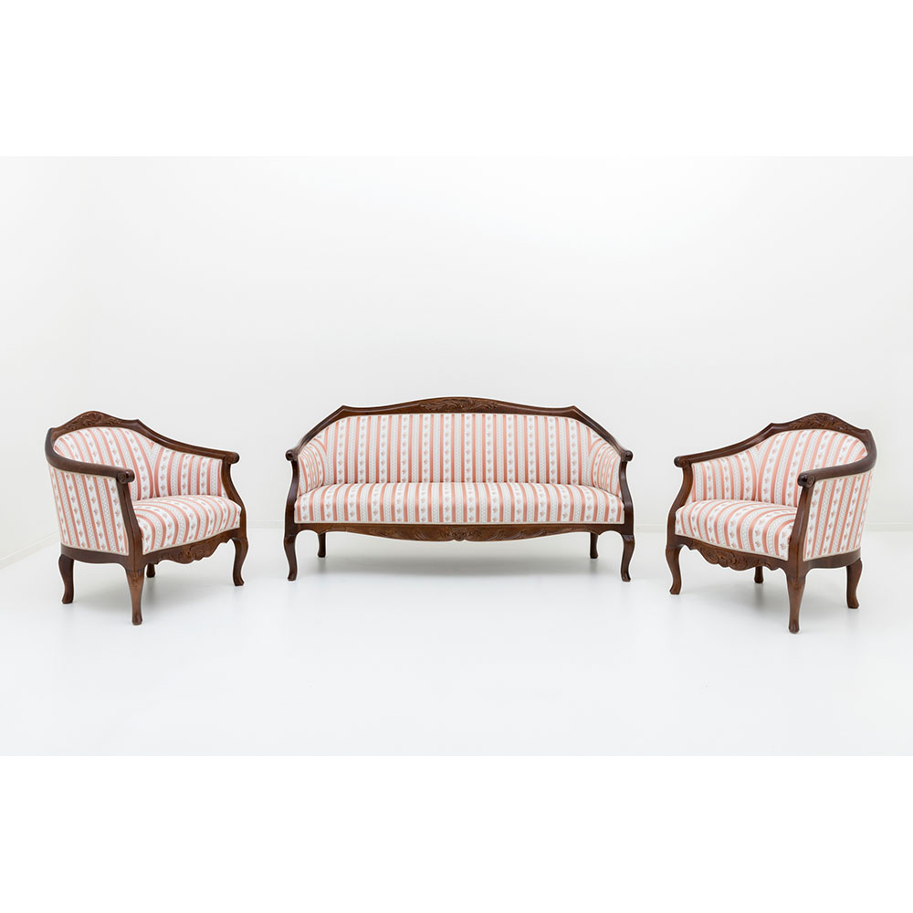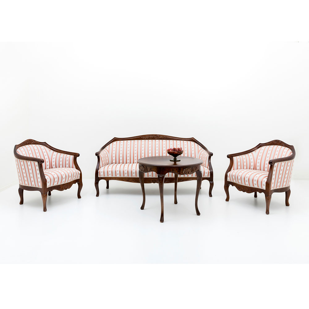 Talonpoikaisrokokootyylinen sohvaryhmä, sisältäen sohvan, kaksi nojatuolia sekä sohvapöydän.