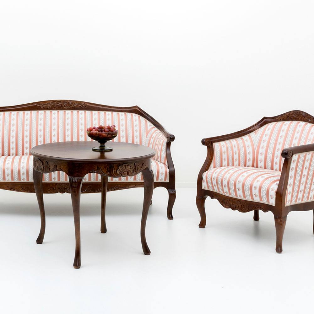 Sohvaryhmään on valittavissa uusi talonpoikaisrokokoo malliston sohvapöytä, joko pyöreä kuten kuvassa tai suorakaiteen muotoinen. Uusi sohvapöytä sisältyy kaluston yhteishintaan.