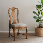 Talonpoikaisrokokootyylinen tuoli, jossa on verhoiltu istuinosa sekä käsin veistetyt koristekuviot.