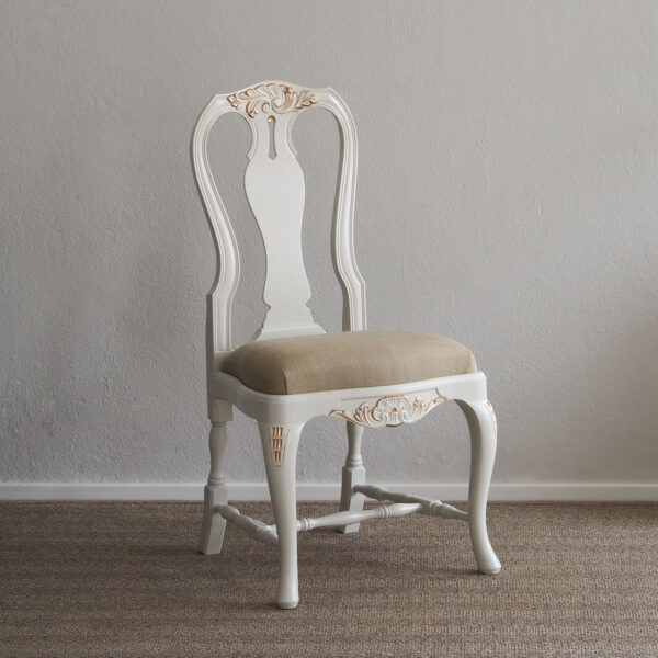 Talonpoikaisrokokoo tuoli soveltuu ruokapöydän tuoliksi tai muuksi pikkutuoliksi.